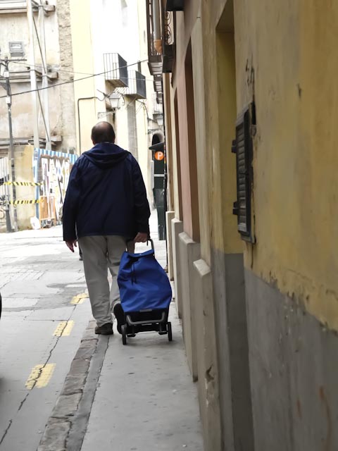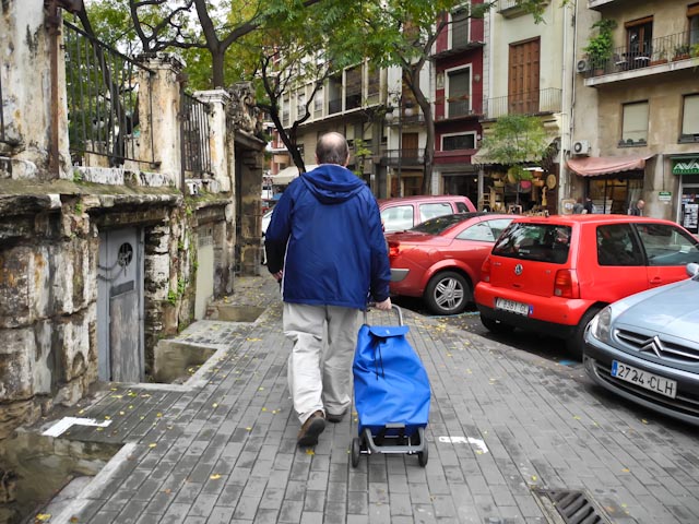 As soon as she saw us Cristina opened the fridge at her stall and took out the turkey. In the space of a minute Mr. Turkey was resting comfortably in the confines of our new two-wheeler. Navigating the narrow sidewalks of Valencia with the cart reminded me of wheeling Susan around in the wheelchair when she had suffered her ankle sprain. One has to study one’s route carefully in order to make sure that you and your cart can get by and avoid streets that are badly in need of repair or situations where you and your cart can’t get by. However, under the heading of life’s challenges, I guess this would go far down on the list.
