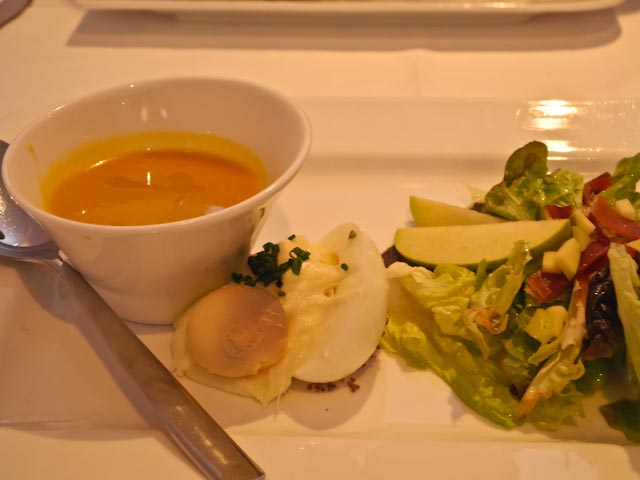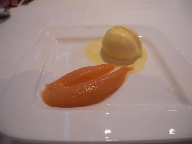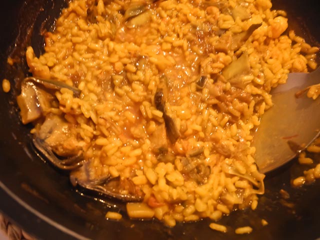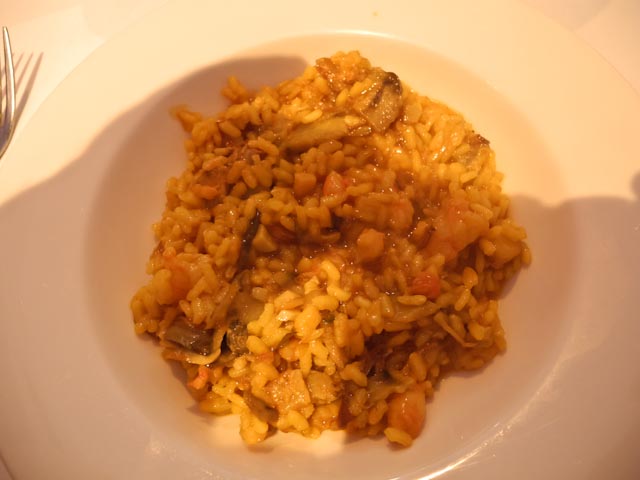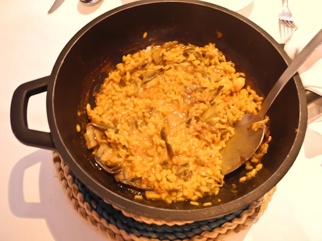 Once again we opted for the menú del día and were not disappointed. Yesterday’s appetizers included a pumpkin soup, a salad with pieces of apple and ham, and a hard boiled egg that was filled with a mixture of mashed potato and salt cod, which is often called a brandade. For our main course we chose an arroz meloso con gambas y alcachofas (rice with shrimp and artichokes). For dessert we had some homemade membrillo accompanied by a small scoop of vanilla ice cream. Membrillo is the Spanish name for quince paste that is usually commercially available in a jellied form. The membrillo we had was in sauce form and it mated exquisitely with the ice cream. We both had a coffee and headed back home.
