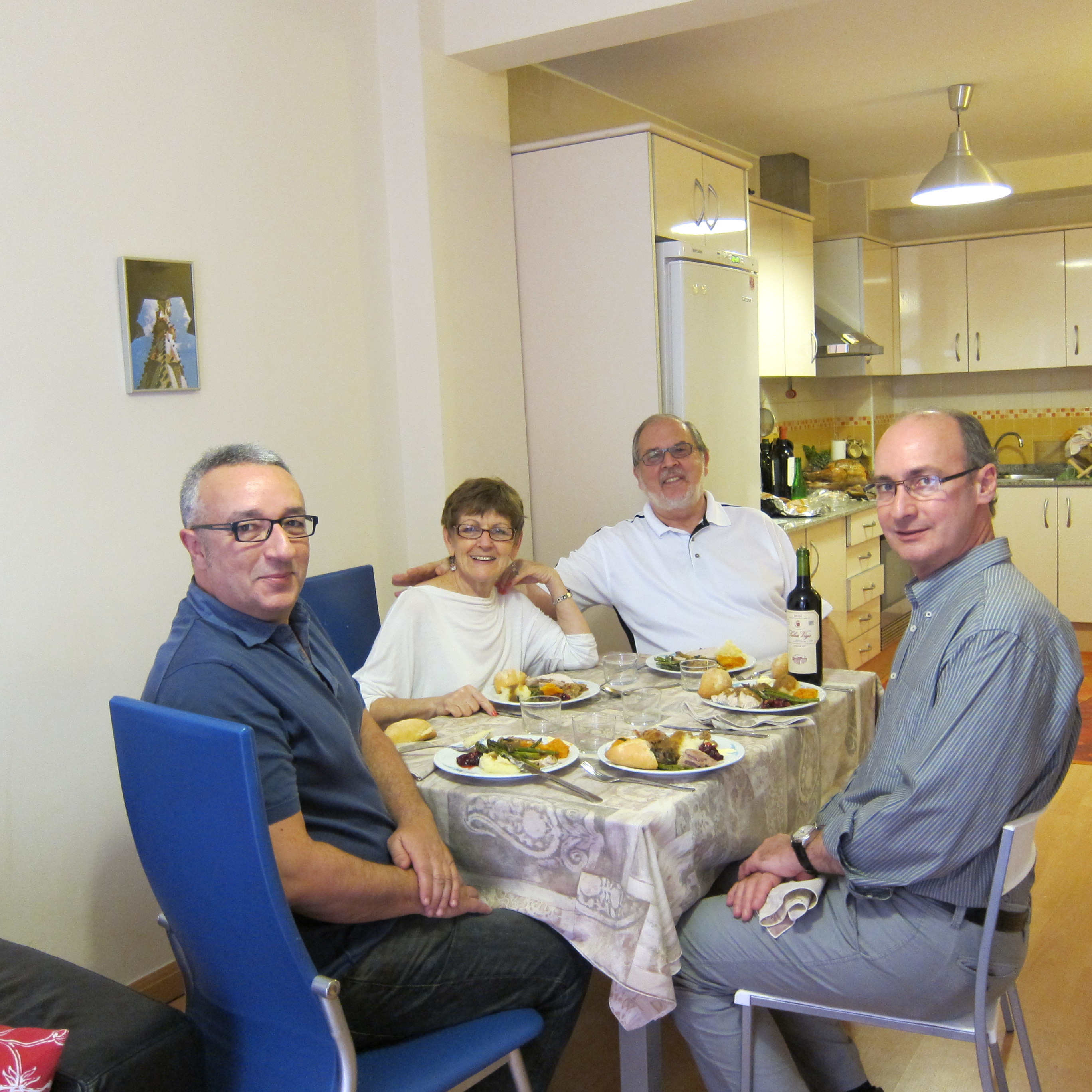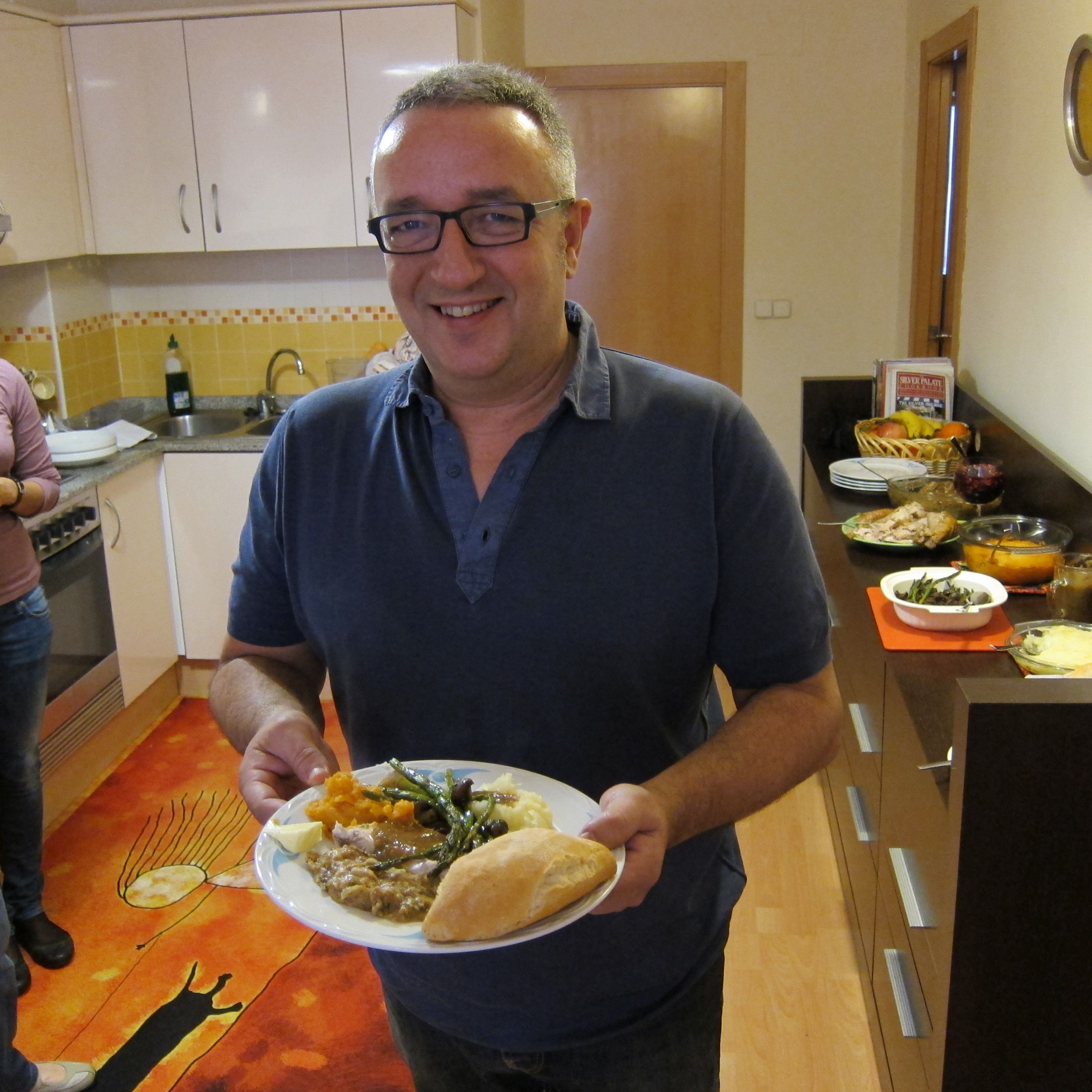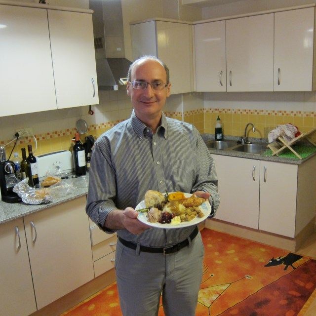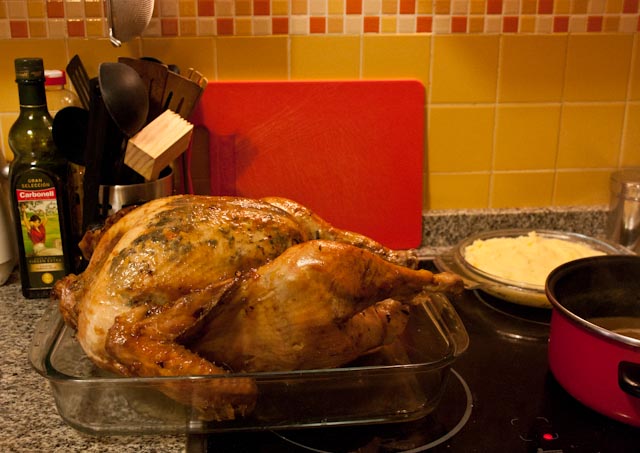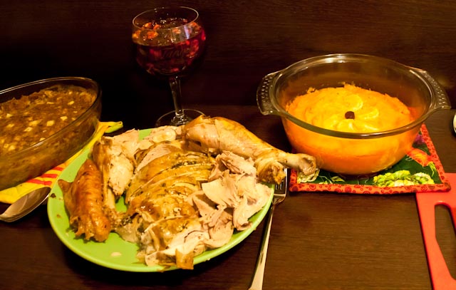Pepe brought a bottle of wine and a bottle of champagne; Vilma also brought a bottle of wine. Brian did yeoman’s duty bringing a pumpkin pie, a mango and passion fruit pie and an asparagus and mushroom casserole. We gathered around the coffee table with either a beer or a glass of wine in hand and we nibbled on a mixture of olives, gherkins and cocktail onions, as well as some pate. We chatted animatedly until our conversation was interrupted by the timer announcing that everything was ready.