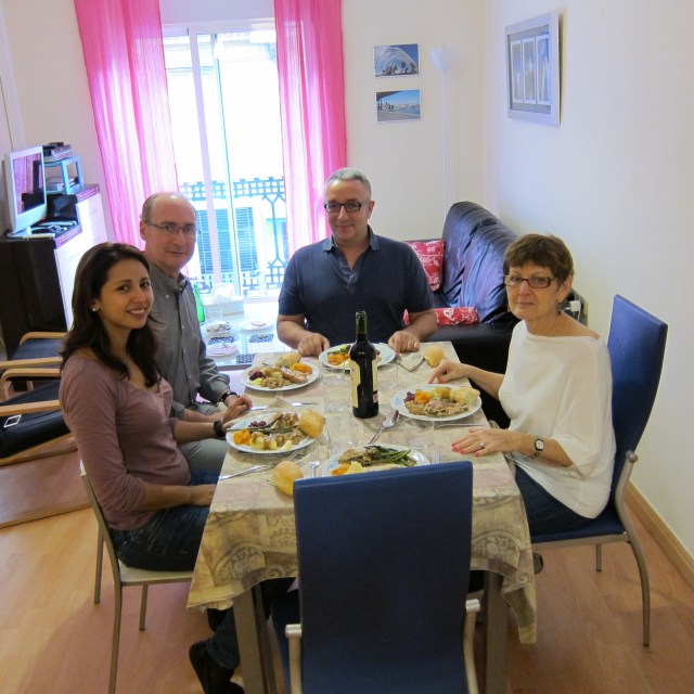 I ran out to do an errand and when I returned Susan had already set the table using a tablecloth and napkins that Brian had lent us. She had pulled the table to the center of the room so that all five of us could fit at the table. Given how small the table was, we decided that we would put everything on the sideboard and let everyone serve himself or herself. We had invited our guests for 2:30 and they all arrived on time.