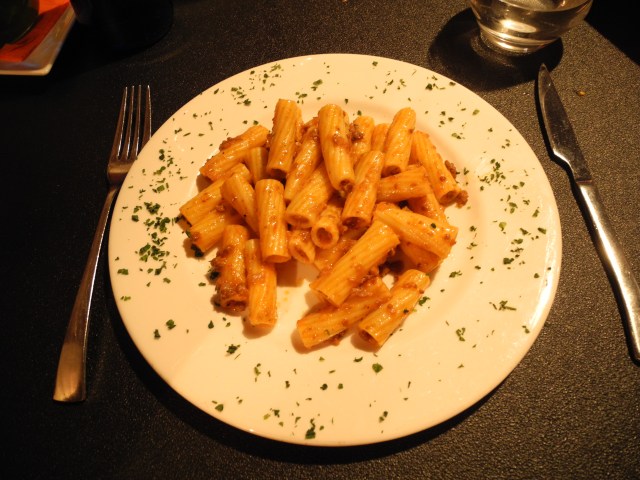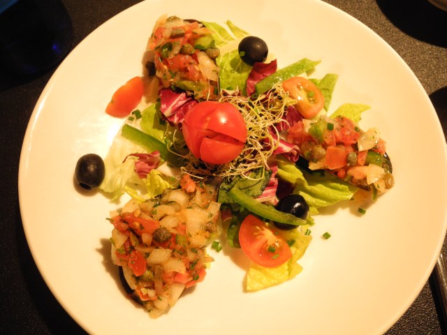 Our destination was La Fórcola because when we passed by on our way home from the market we liked the menu of the day. Susan and I both chose the salad with mussels and the pasta Bolognese. The salad with mussels was made up of a variety of lettuces, cherry tomatoes and green pepper with three mejillones a la vinagreta. Mejillones a la vinagreta are mussels that have been steamed and then covered with a mixture of chopped onions, tomatoes and green pepper that have been marinated for a while in vinaigrette. The pasta was cooked perfectly and the meat sauce was quite tasty. I had a glass of wine with my meal and Susan opted for water. For dessert Susan had cheesecake and I had the tiramisu. We finished the meal with a coffee and went back home.