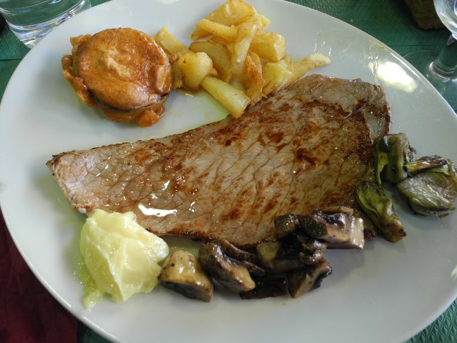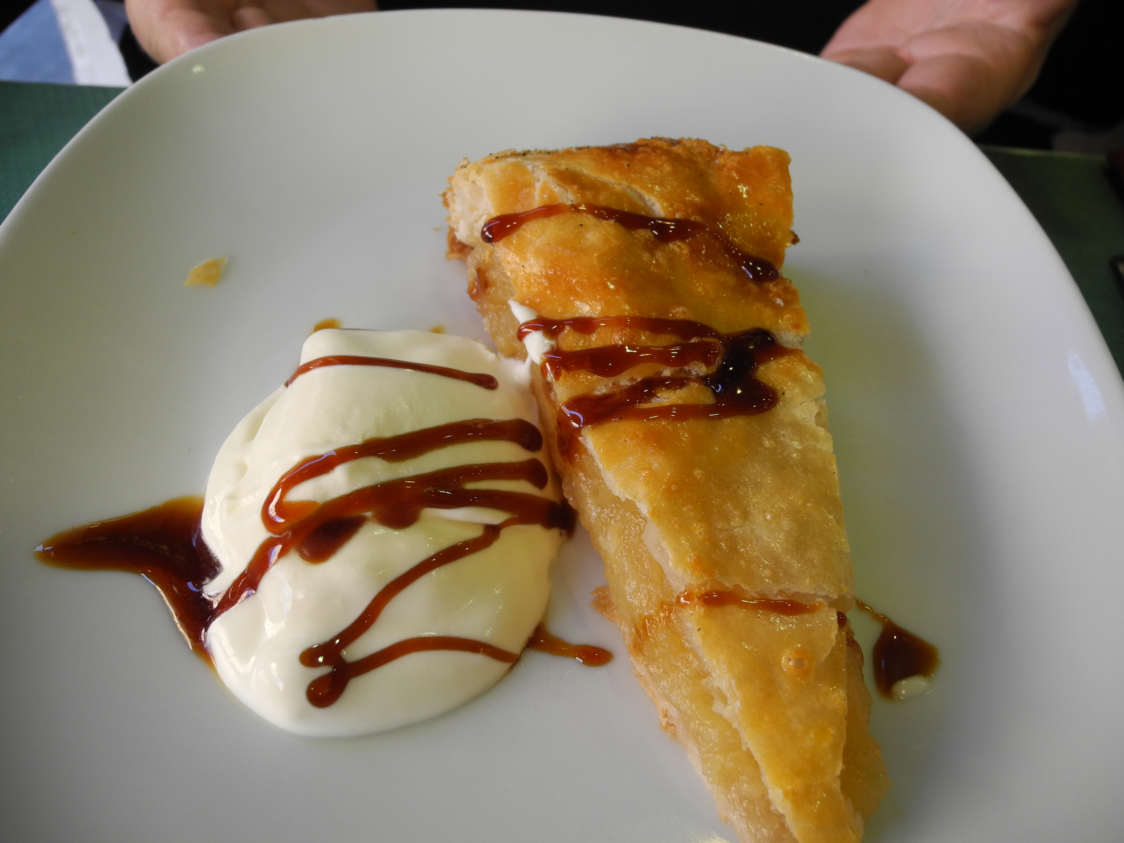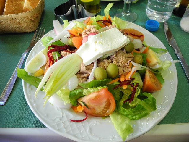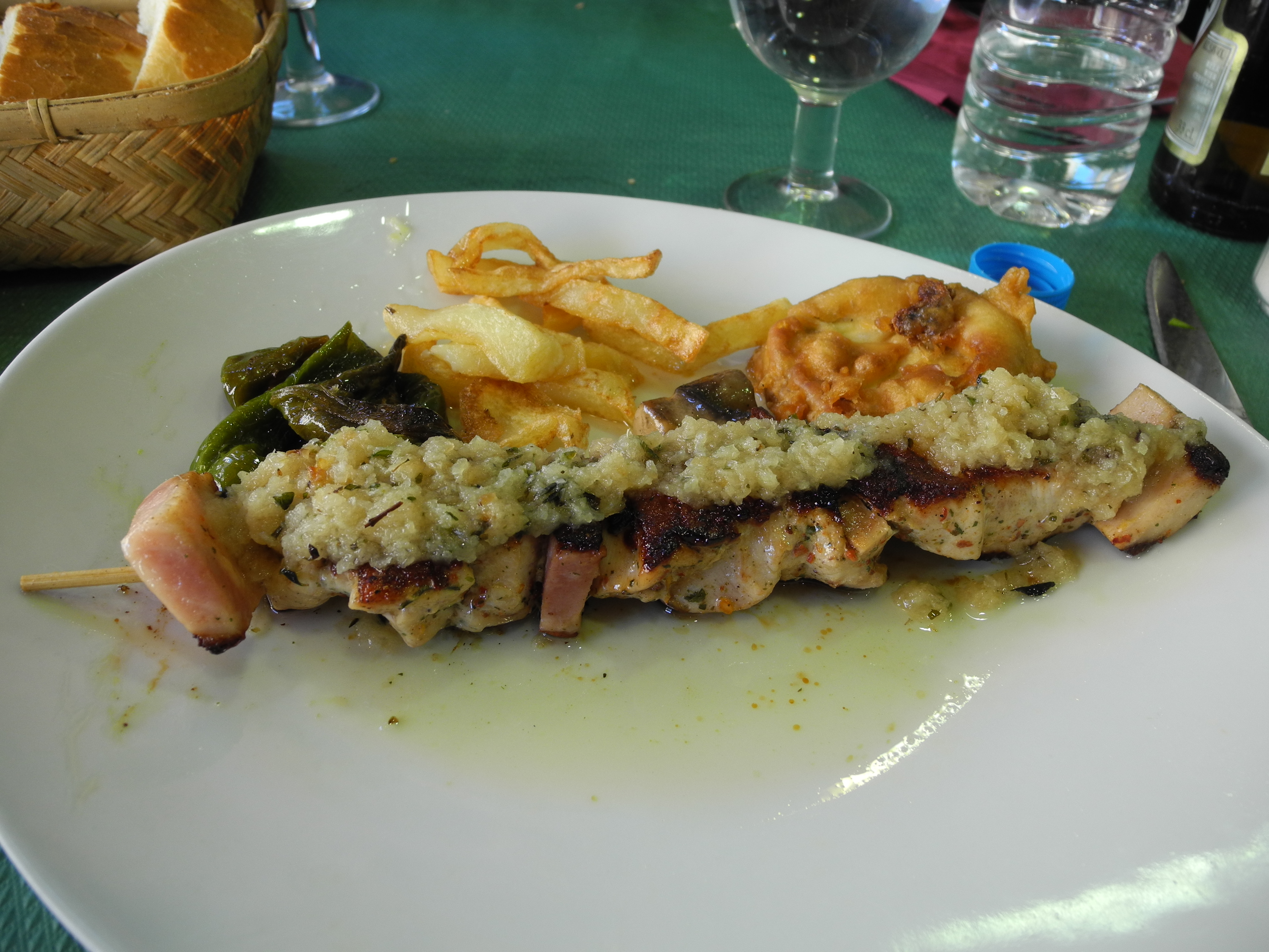When we got home we unpacked the roller and gave some thought to lunch. Since Susan had an Aqua Fitness class at 3:30 we decided to eat early. We went over to the restaurant at Rojas Clemente to let Enrique prepare lunch for us. We both started with an ensalada valenciana, which had a little bit of everything in it = lettuce, tomatoes, carrots, beets, olives, radishes and tuna. Susan ordered the chicken brochette as her entrée and I had the filet. Susan and I shared our desserts. I had ordered the almond cake and she had ordered the apple pie. We finished the meal with a coffee.