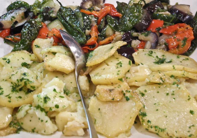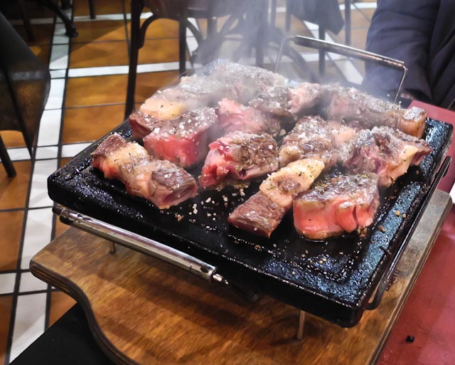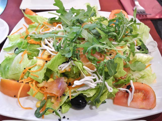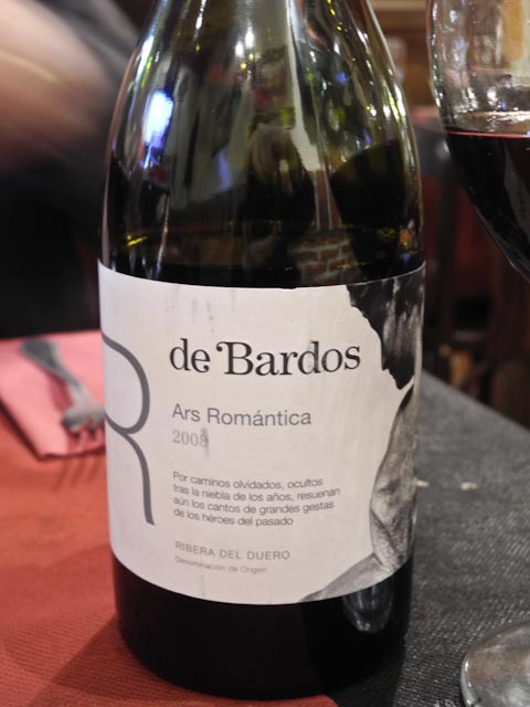 We decided on the house salad and a steak. The house salad, in addition to the usual complement of vegetables, had bits of smokes salmon and was topped with a sprinkling of black Norwegian caviar. The steak was delivered to the table on a sizzling grill and we let the steak cook to its desired doneness. The steak was accompanied by a ratatouille and some potatoes that had been sautéed in olive oil and garlic. We chose a bottle of Ars Romántica, which turned out to be a delightful red from the Ribera del Duero region. We were so full at meal’s end that we passed on both dessert and coffee.