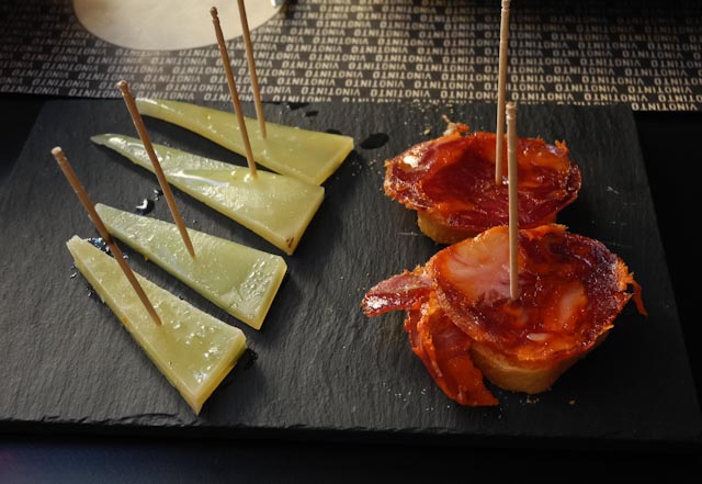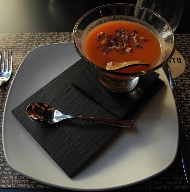 We opted to sit at a table, as opposed to the bar. The room is done in a variety of woods and is both light and airy. We both ordered a glass of wine and while we studied the menu the owner came buy and delivered a starter of chorizo and a bit of cheese. When our waitress returned we ordered some salmorejo, which is an Andalusian take on gazpacho, which means that it is tomato based with the addition of chopped ham and hard-boiled egg. This version also featured a lightly fried slice of eggplant. After Susan finished her soup they presented our three pinchos on a piece of slate.