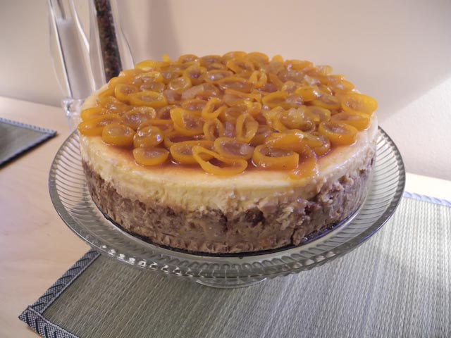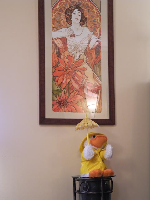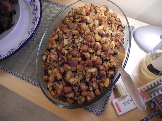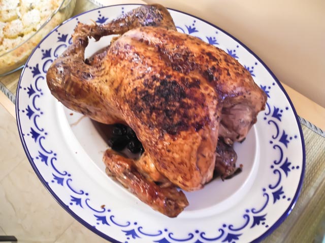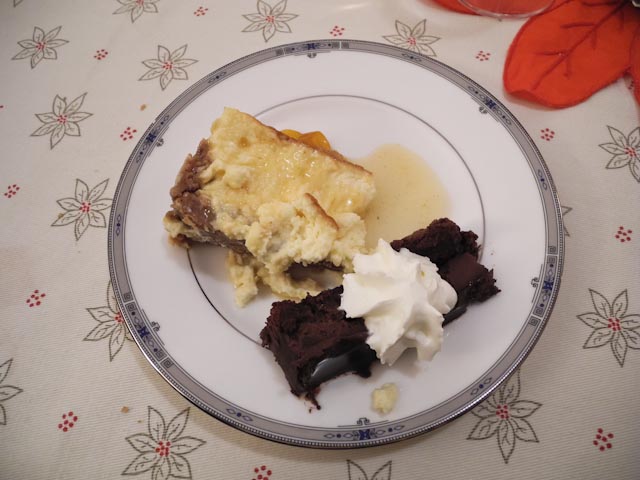 We started with a shrimp cocktail and when we had finished Brian paraded out all the dishes he had prepared for our meal. The centerpiece was a turkey done to perfection. Along with the turkey he had prepared a potato casserole, stuffing and green beans almandine. There was also cranberry sauce and, of course, gravy. We opened a double bottle of Rioja and proceeded to demolish our overly filled plates. As if that were not enough the desserts made their appearance. Brian had made a chocolate cake that featured three different kinds of chocolate and a cheesecake topped with kumquats. The cheesecake was made with cream cheese, mascarpone and ricotta. Both desserts were absolutely amazing. We had a glass of champagne along with dessert. I should hasten to mention that the guest of honor at our dinner was Dickie the Duck, but even though he was the guest of honor we did not allow him to sit at the table.