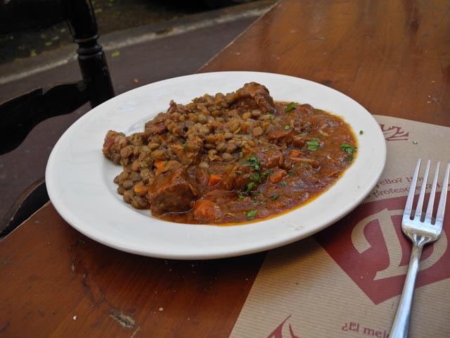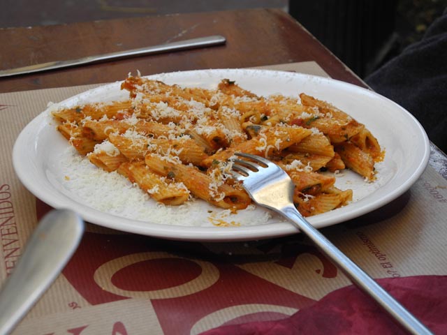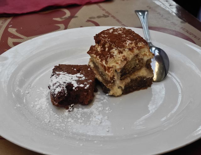 We opted for the menu of the day, which costs a ridiculous 6.5 Euros. Susan chose the spinach salad and I had what they called the ensalada siciliana, which consists of a variety of lettuces, olives and goat cheese. For our main dishes I chose the pasta genovese – penne pasta with a meat sauce that was spiked with basil – and Susan chose the goulash with lentils. Dessert was tiramisu and coffee was a necessity. I had two beers and Susan had a glass of wine. The bill was 19.8 Euros. Score!