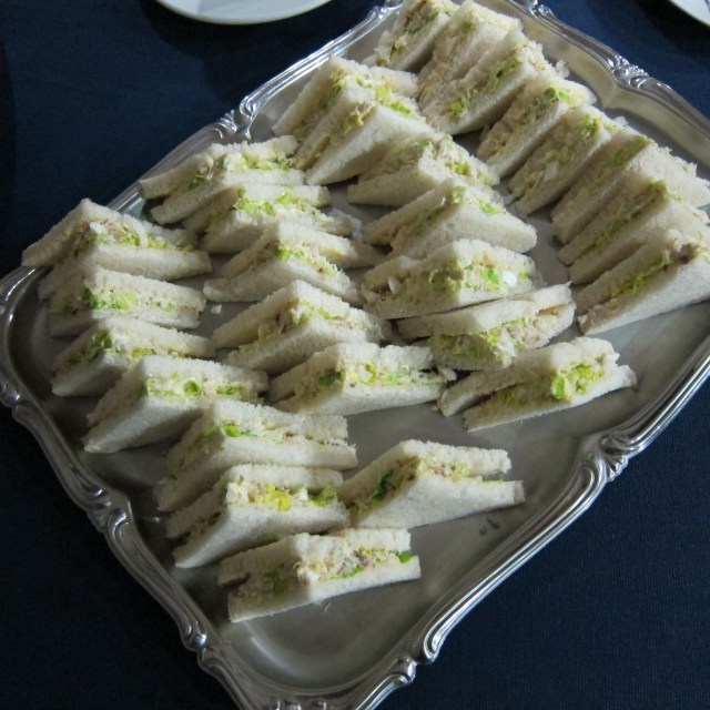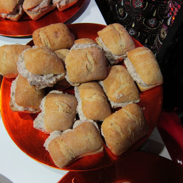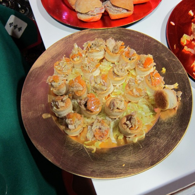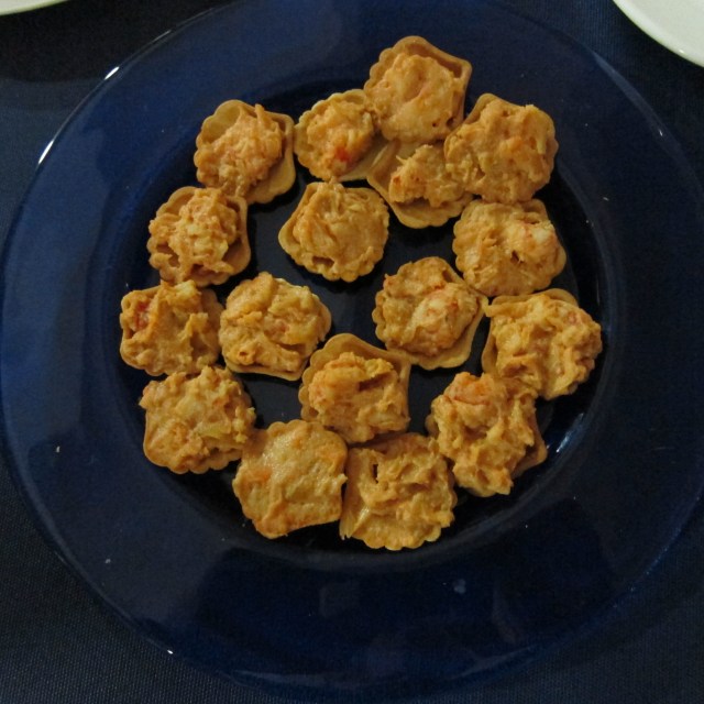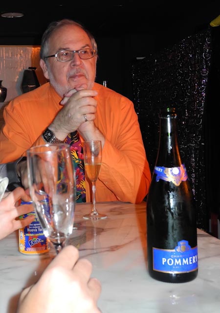 Pepe was the first one through the door at 9:30 and was genuinely surprised when we turned on all the lights and sang Happy Birthday to him. He made his way through the crowd and greeted everyone who was present. As he made his way to the front of the room the sound of champagne corks popping filled the room. After several toasts the first four dishes of the evening made their appearance. There were finger sandwiches filled with a seafood spread, a caviar dip, pastry shells filled with a seafood mixture and a melted Brie with pineapple. The champagne was Pommery and it was the perfect accompaniment to the four starters.