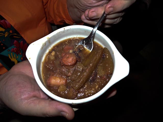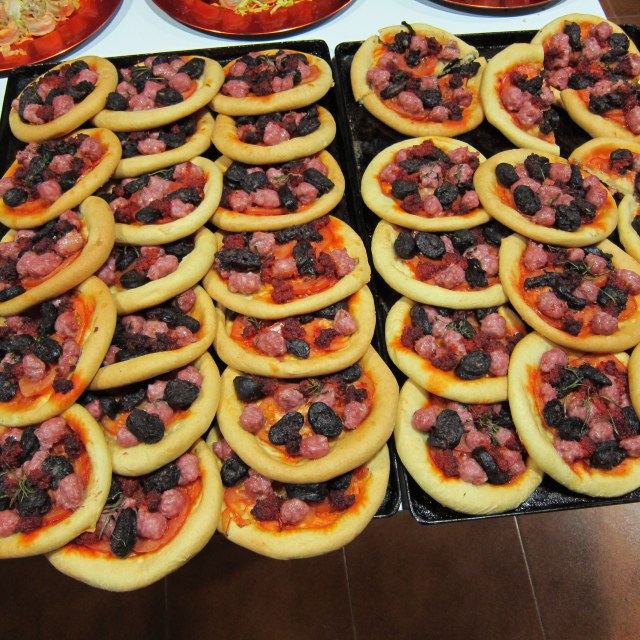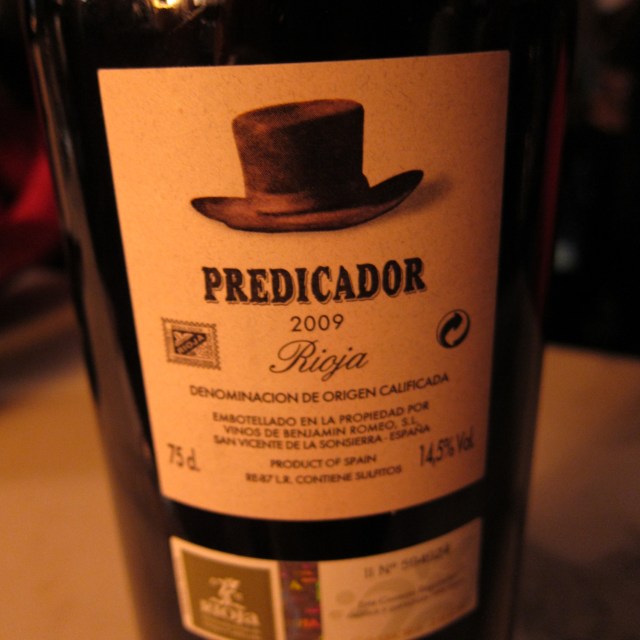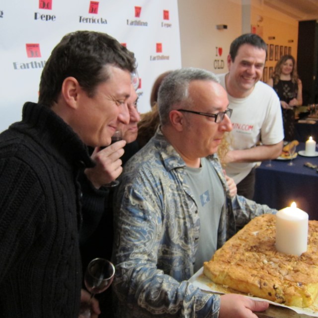 We cleared the tables in order to make room for the next four dishes. Two of the dishes were Jordi Morera creations. One was a stew made with octopus and thistles and the other was a coca crowned with a variety of charcuterie. There were also mini-sandwiches filled with slices of sirloin and a pastry filled with quail. The wine to accompany these four dishes was courtesy of Benjamín Romeo owner of one of the most prestigious wineries in La Rioja. He had sent along magnums of his Predicador wine with special labels for the occasion.