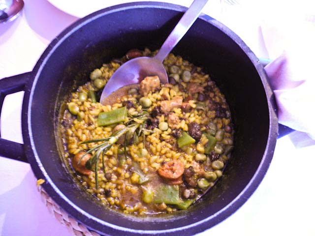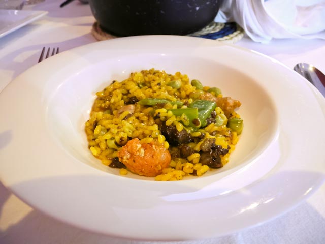 I got in a brief afternoon workout yesterday and when I got back home we went out to lunch.  Since we had not had lunch at A Nou for a while we simply crossed the street and there we were.  The restaurant was crowded and Javi, as usual, was the only one on the floor.  We ordered an arroz con embutidos y habas as our main course.  The appetizers of the day were a revuelto de langostinos, a puff pastry studded with slices of lamb and a carrot and yucca soup.  The soup was rather bland, but the other two appetizers were excellent.  The rice arrived soon after and it was studded with a variety of sausages and beans.  It was both tasty and appropriate for a cold day.  It was a little after 5:00 when we finished our lunch.