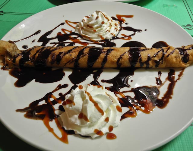 Susan started her meal with a rather traditional salad and I chose the pasta salad with chicken. For her entrée Susan chose a ham and Camembert crepe and I went for the chicken, bacon and onion crepe. Both were delicious. Susan chose a fruit crepe with chocolate sauce for her dessert and I decided on a homemade dark chocolate cake. I had a beer and a glass of wine and Susan had a glass of wine. We finished our meal with a coffee and then paid the bill, which was a whopping 21 Euros. From the restaurant we went directly home and I opted for an afternoon siesta.