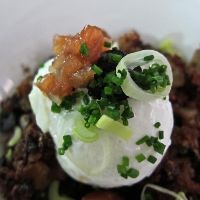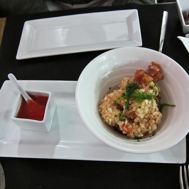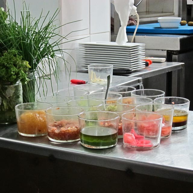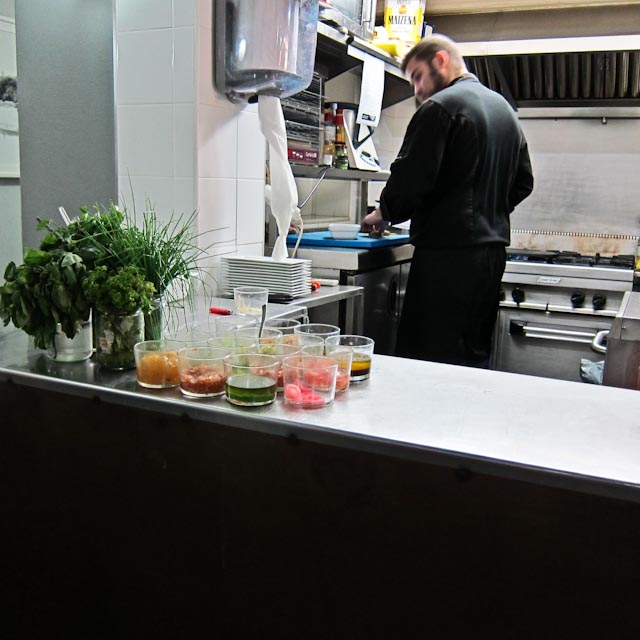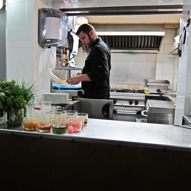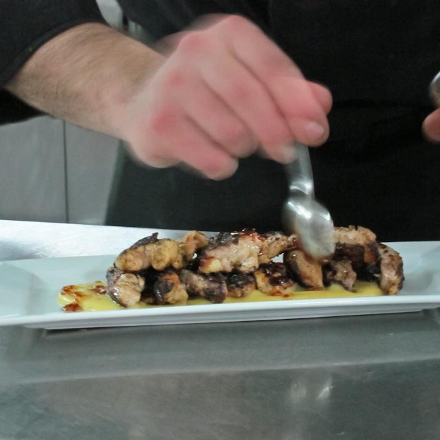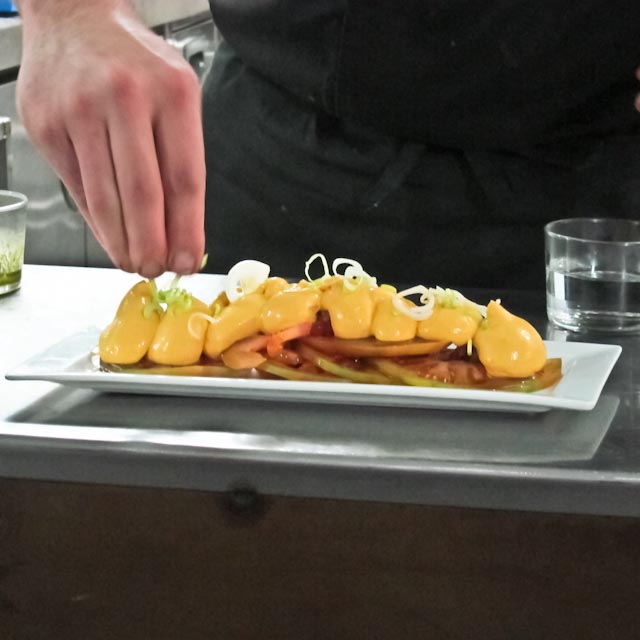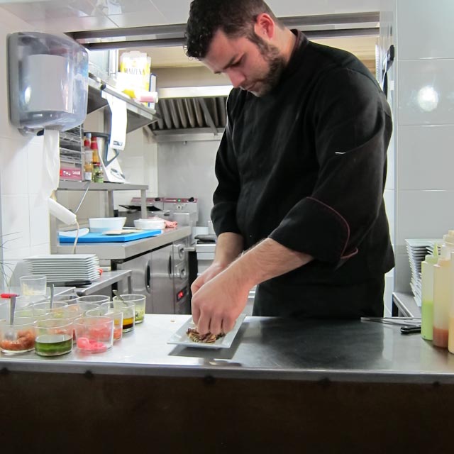 Carlos is originally from Barcelona and began his kitchen apprenticeship when he was fifteen. He has cooked in a number of different restaurants and watching him prepare a variety of dishes it is clear that he is both skilled and inventive. I jokingly said to him that in addition to cooking skills, it helps to be a surgeon and an architect so that one can construct what, in the end, are tasty and eye appealing dishes.