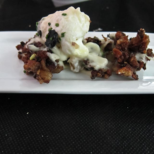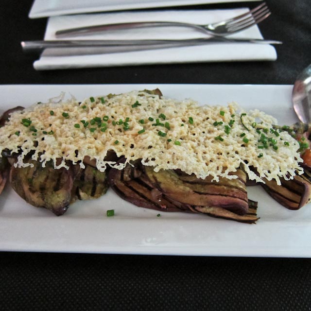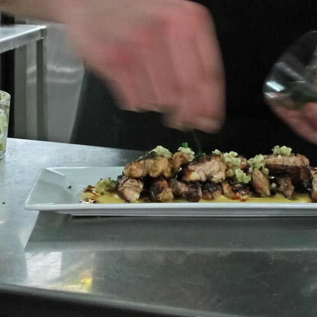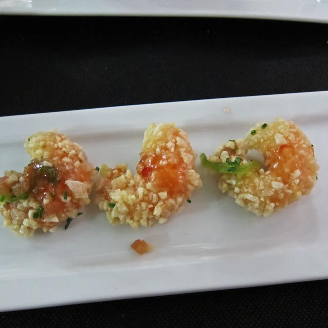 The menu features a variety of vegetarian dishes, fish dishes and meat dishes. Everything is served tapas style and that means that whatever dish is ordered goes into the center of the table as it is meant for sharing. We began with an eggplant dish that consisted of thin slices of eggplant that had been cooked off on the grill and then covered with a pesto sauce. Next came a plate of langoustines that had been coated with crumbs from crushed shrimp chips and then pan-fried. Our last dish was a plate of migas made with morcilla and black truffles that was sitting on a bed of pureed leeks and mashed potatoes. If you are not sure what migas are here is a link that will clarify the matter for you http://spanishfood.about.com/od/spanishfoodfaqs/f/what-are-migas.htm. Everything that we tried was superb. We also had the opportunity to watch Carlos, the chef, prepare a number of other dishes for a party of four that came in when we were about halfway through our meal.