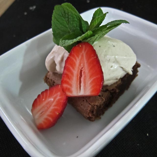 There was only one server in the room and that was Ana. Ana is originally from Rumania and has spent time in Pasadena, California. She has been in Valencia for a number of years now and really likes it, as do her sisters when they come to visit. As each dish came to our table Ana would give us a detailed description of what we were looking at. She also recommended a lovely Valencian red wine that went perfectly with the three dishes we had ordered. She asked if we wanted dessert and we were unable to resist a brownie topped with a praline cream. Coffee was in order and so was a chupito or two. It was close to 4:30 when we pushed back from the table, said our goodbyes and made our way home.