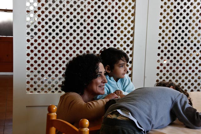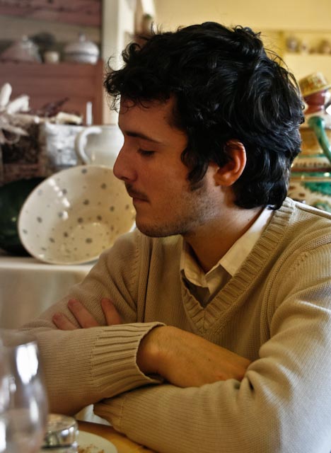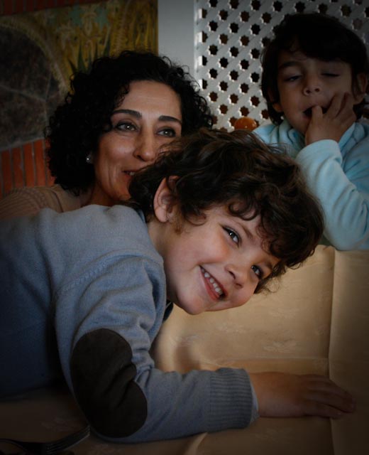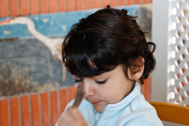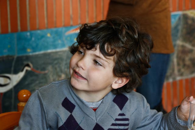 The door was covered with all kinds of awards proclaiming this particular restaurant as one of the best in Valencia and in all of Spain. We walked past a waiting area that was populated by enormous stuffed animals and we walked into the dining room proper. We were warmly greeted and show to our round table for six. In addition to the four of use we were awaiting the arrival of Juanra, the real estate agent who had found Brian and Ofelia their current apartment and his girlfriend, Adela. Adela teaches French at the University of Valencia. No sooner were we settled at our table when Manolito, the four year old son of the owners, sat down at a table near the entrance along with his young friend, Santi. Ofelia went over to take a picture with him and I followed.
