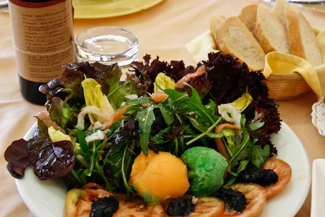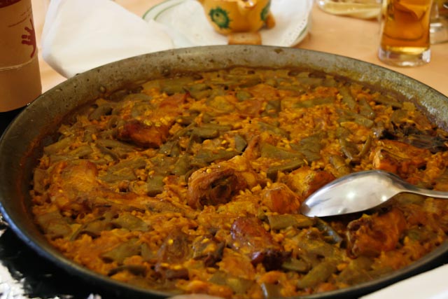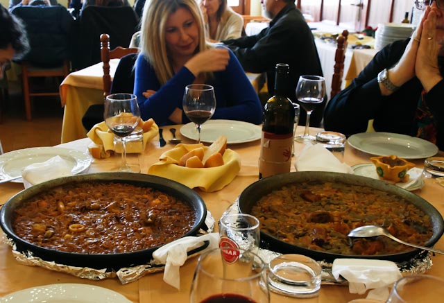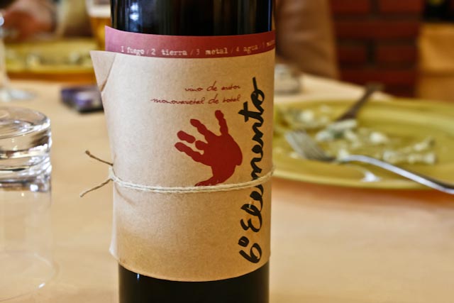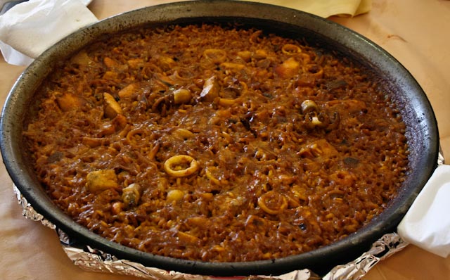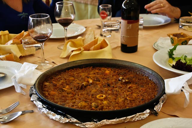Brian had pre-ordered two paellas for all of us. The restaurant requests that you do that because the paellas are cooked over a wood fire and they want to make sure that they have sufficient wood set aside for the preparation of the paellas. We ordered three appetizers – a stuffed artichoke, some octopus cooked over a wood fire and a salad that in addition to the lettuces and tomatoes was topped with two different sorbets. There was also a basket filled with fresh baked bread and a homemade crock of paté. We ordered a bottle of wine from an extensive wine list. We focused on the section that was called vino de autor and we chose a wine called Sexto Elemento. The production of this wine, made entirely from Bobal grapes, was limited to one thousand bottles. It was a hearty red with a silky mouth feel and we made both bottles magically disappear.