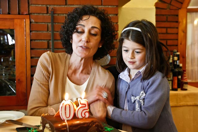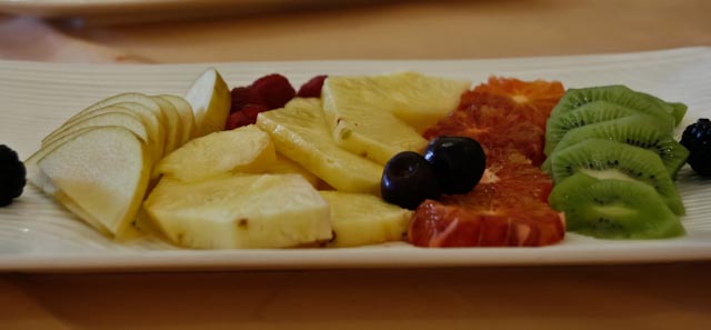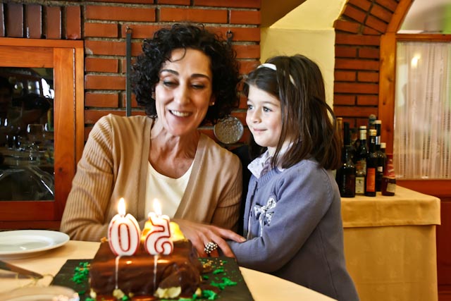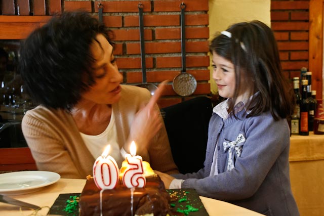 Dessert arrived in the form of a sinful chocolate birthday cake. The entire restaurant sang Happy Birthday to Ofelia. A little girl from a neighboring table came over and helped Ofelia blow out her candles. To reward the little one for a job well done I made a balloon heart for her, also. In addition to the cake there were two plates of fresh fruit and a bottle of champagne made its appearance at our table. All of us ordered coffee and several of us had an after dinner liqueur. The table was then cleared and María Dolores joined us and I proceeded to do a half a dozen magic effects.