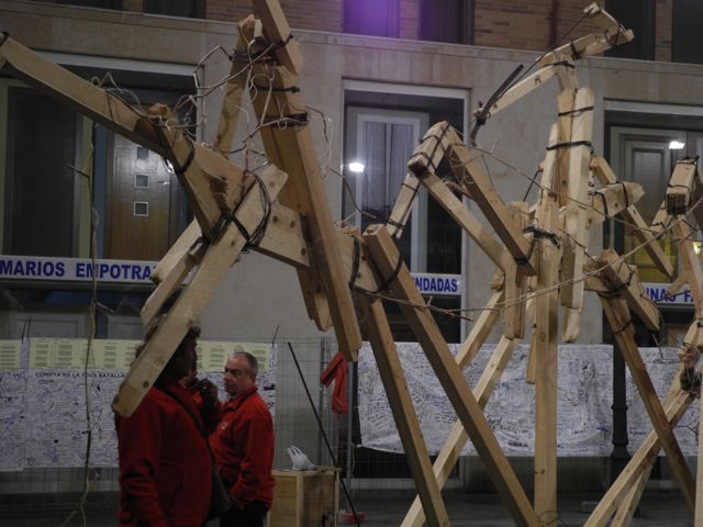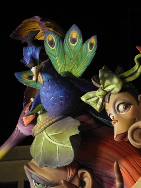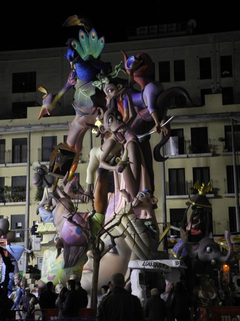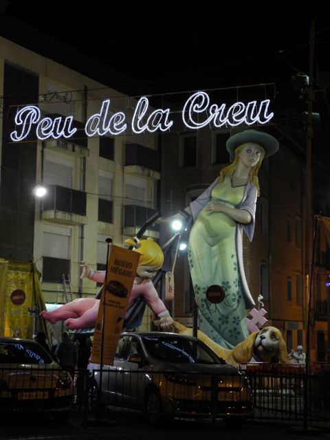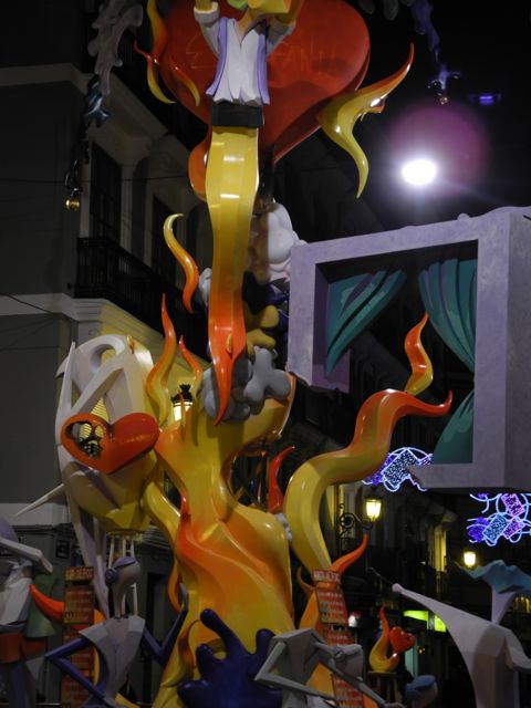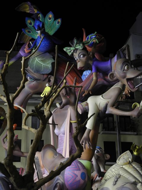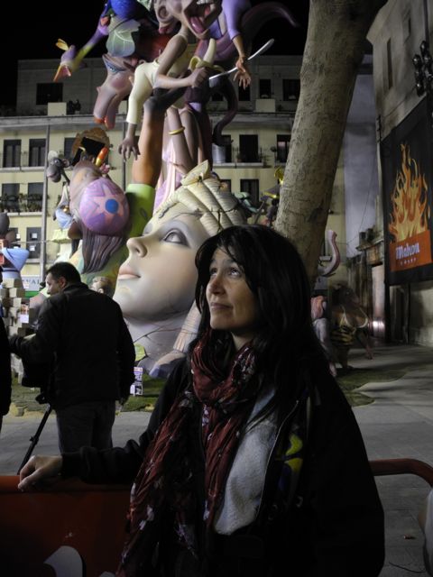 Around 9:00 PM the falla outside our balcony was moved down the street to the intersection of Borrull and Botánico where it could be away from neighboring buildings. There had been a constant report of firecrackers since 3:00 PM and the rhythm of the explosions did not diminish one whit as the night progressed. At 11:00 Susan and Rachel ventured forth to witness the burning of some of the fallas. At 2:00 AM, as they were about to light the falla of Pilar the skies opened up and it began to pour and Rachel and Susan sought shelter under a nearby portico. They returned home thoroughly drenched and napped briefly before the alarm went off at 4:30. They dressed and went downstairs to meet the cab that was waiting outside our front door. As I write this she is forty-five minutes into her flight to San Francisco. Today’s photos are courtesy of Susan.