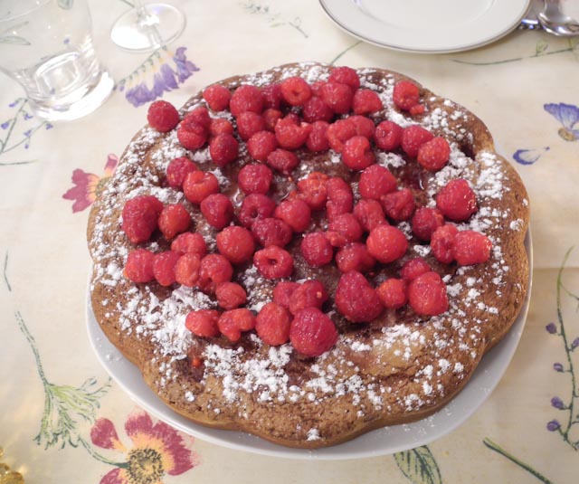 Brian went all out and we filled out plates with leg and shoulder of lamb, haricots vert, carrots seasoned with ginger and cinnamon, and oven baked potatoes. Bran had also baked a cake that was topped with raspberries and to which we could add either a chocolate hazelnut sauce or whipped cream. Some of us added both. While we eat we talked about a future visit we are planning to make to Lisbon. Brian and Ofelia talked about things to see and do and lent us a number of books so that we could do a bit of homework before we go. The discovery that Lisbon is very hilly means that my knee will have to be in very good shape before we go.
