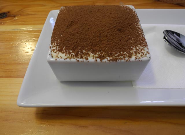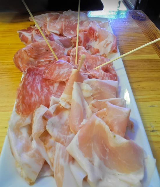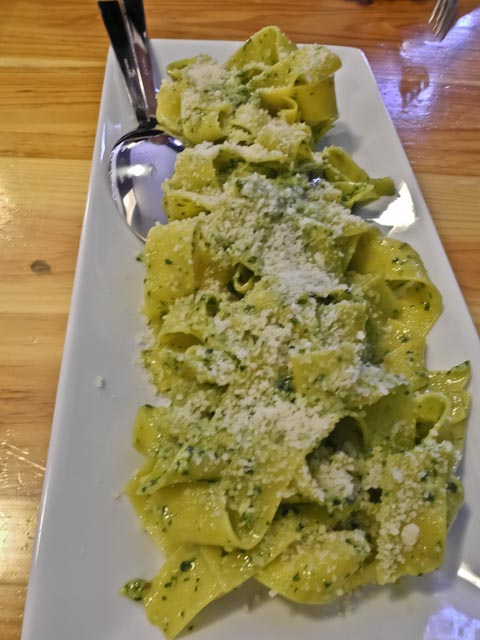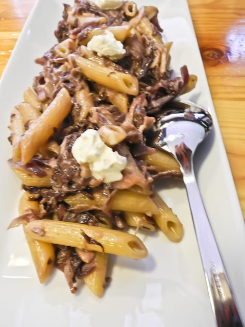 Yesterday we decided to have lunch at Ballando Nudi – Francisco’s new place. We sat down and chatted for a while and when he asked us what we wanted to eat, we just looked at him and said, “Feed us!” He started us off with a breadbasket filled with Galician style bread. It is a very dense bread and it is flavorful. He then placed a plate filled with a variety of Italian cold cuts. There was salame, guanciale, porchetta and pancetta. He also served us a plate with a variety of cheeses all of which were topped with homemade marmalades. The two standouts were a smoke scarmozza and a gorgonzola topped with a red onion marmalade. Next came two pasta dishes. One was a plate of tagliatelle topped with a pesto sauce and the second was a plate of penne topped with a sauce that included wine, endive and Speck. We were unable to finish the pasta dishes and we took them home with us for later consumption.