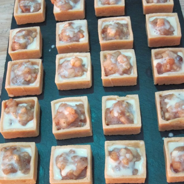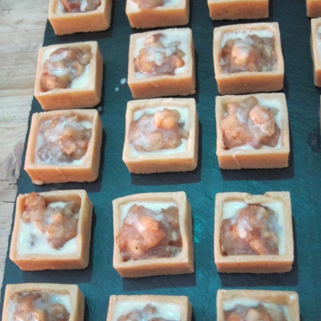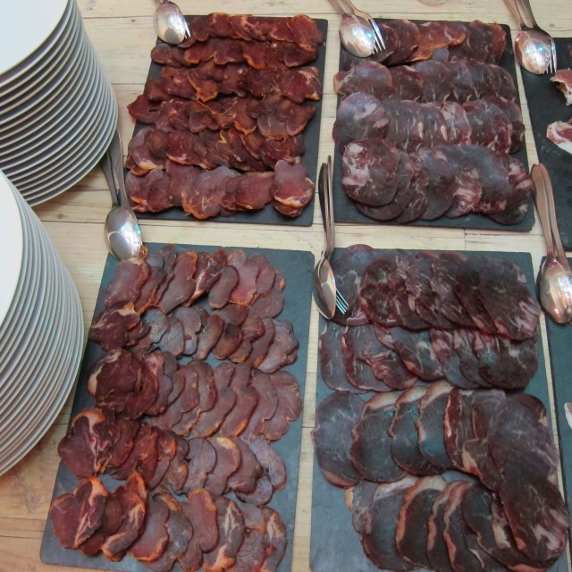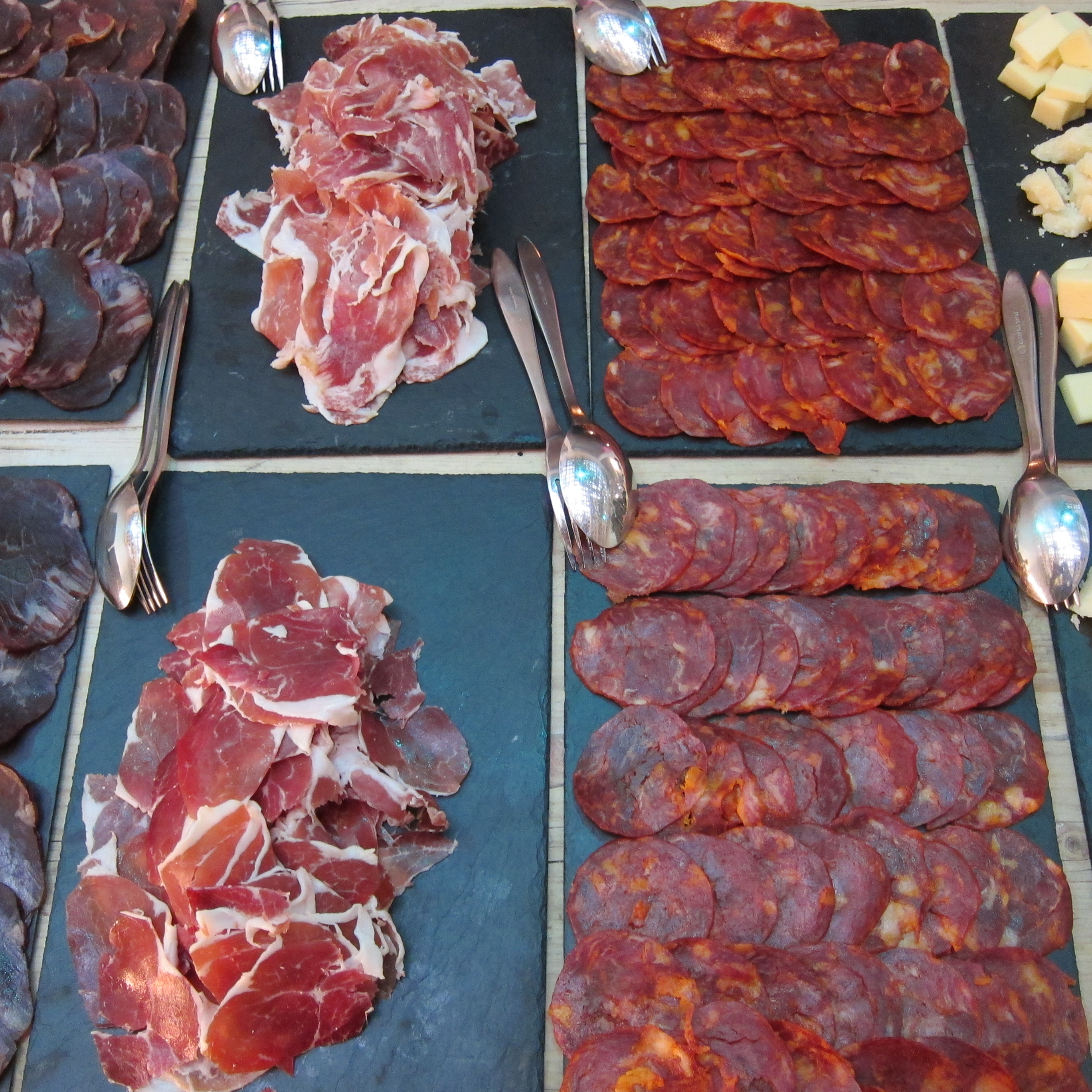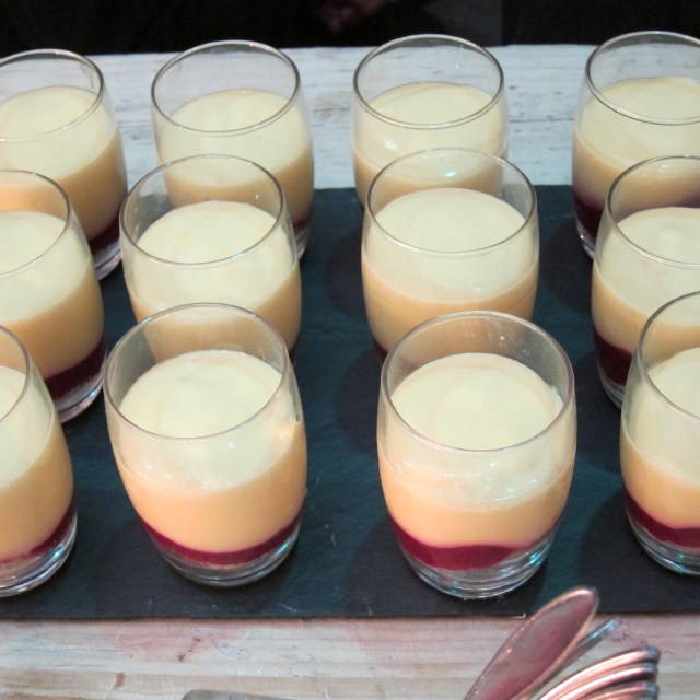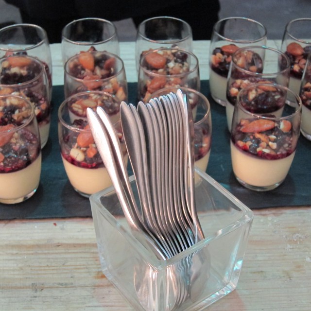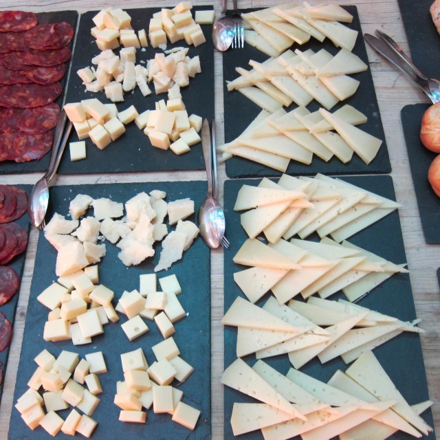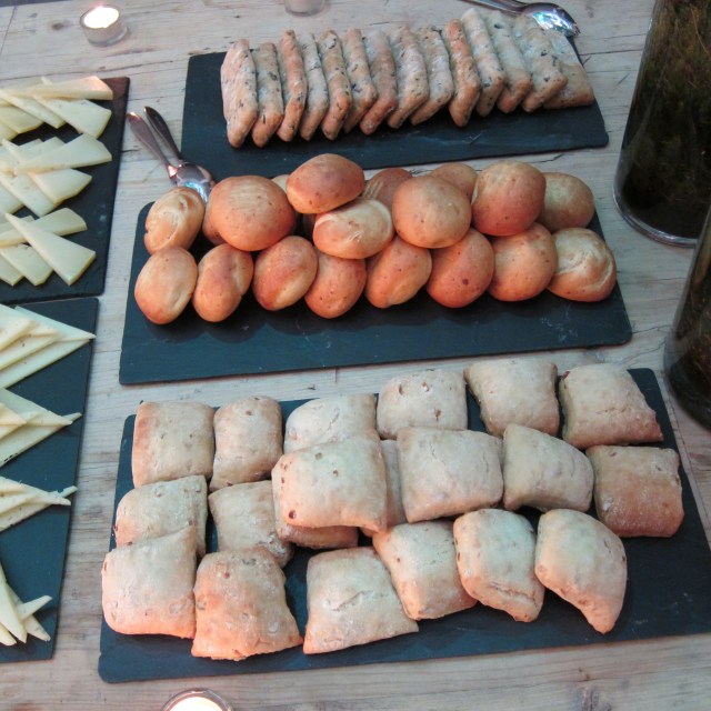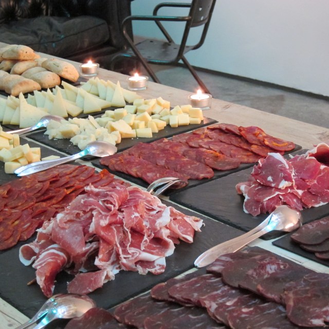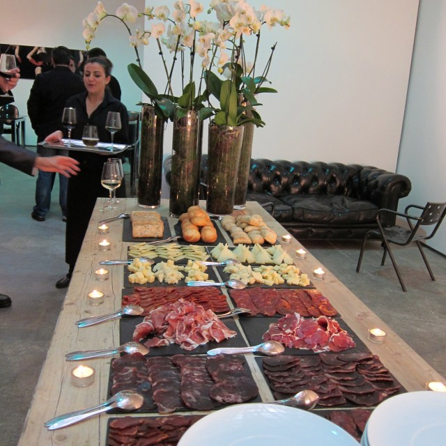 The servers passed wine, beer and a variety of soft drinks and water. The buffet table was filled with embutidos, cheeses and a variety of breads. The servers circulated among the guests with gazpacho shots, a canapé of fig and ham and a puff pastry that contained a filling of mushrooms and other goodies. Then they passed cocoanut shrimp, octopus and mini-hamburgers. Little did I realize that there would be more to come. We had sampled the cold hors d’ouvres and now it was time for the hot ones. There was another round of mini-hamburgers, a warm soup, gnocchi and other goodies. The table was then cleared and desserts magically appeared. In addition to a variety of bars and small cakes there were several varieties of pudding, although the word pudding is really not the best word to describe these delights. Spaniards have their cocktails and mixed drinks after the dessert and so there was a table in the back where you could order your gin and tonics, or your scotch and water or your rum and coke or whatever floated your boat.