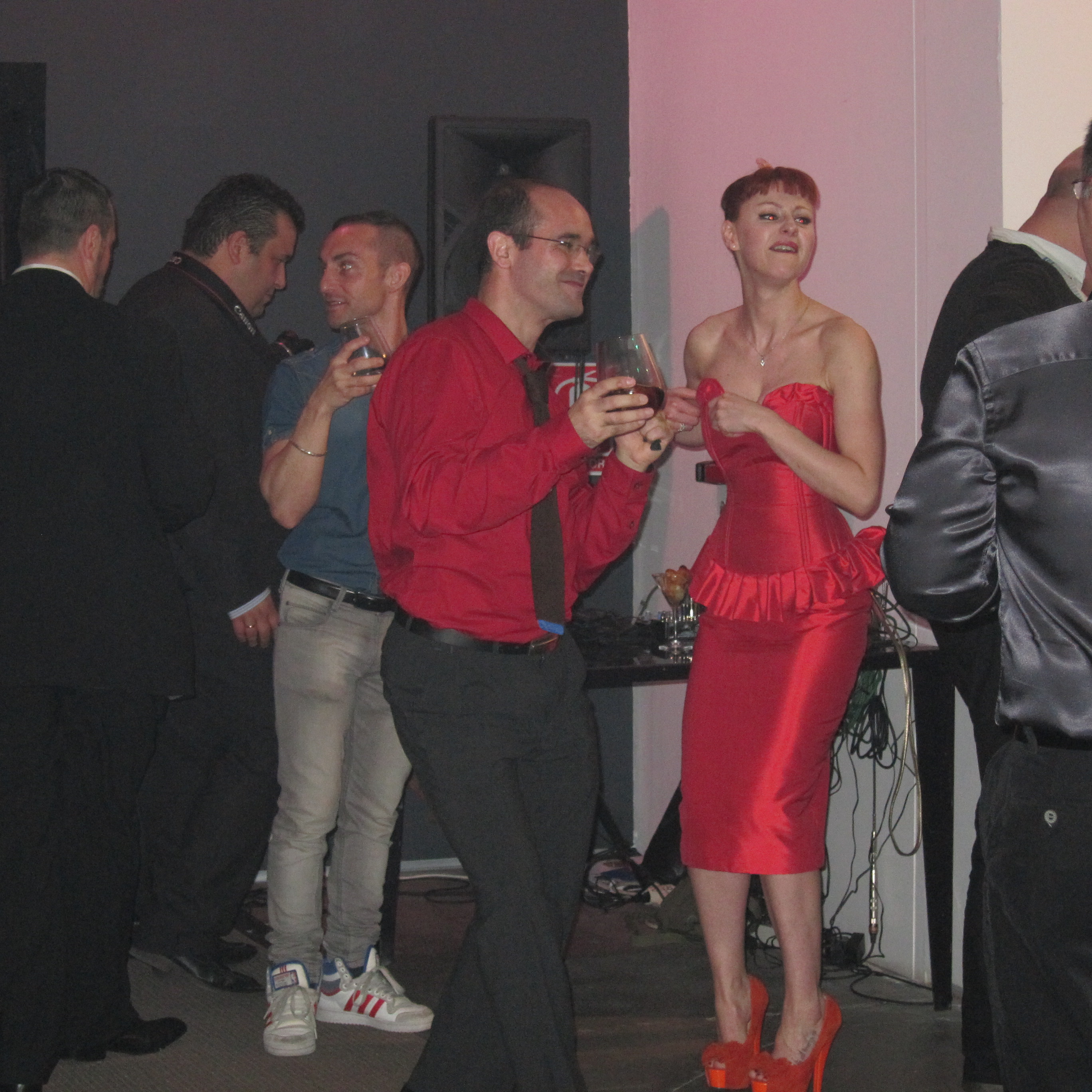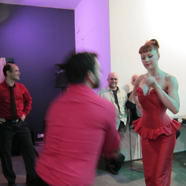 There was a parade of performers who sang and danced and did some hilarious sketches. There was a duo of cross dressers who did four of the skits and at one point they were joined by Mark, the singer from Germany, to do a version of “It’s Raining Men”. There was a Marilyn Monroe impersonator who turned out to be Ramon’s assistant in his current magic production. There was also a male stripper dressed as a bride who did a rather reserved number in deference to the variety of guests present. Finally, there was another champagne toast that was bit different from most. At the bottom of each glass of champagne there was a stone. Most were cubic zirconias, but one of the glasses contained an actual diamond. There was a gemologist present who was there to examine each stone as it was presented.