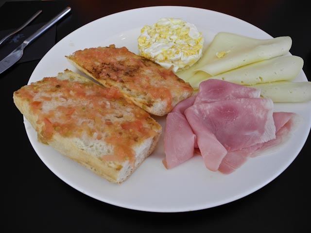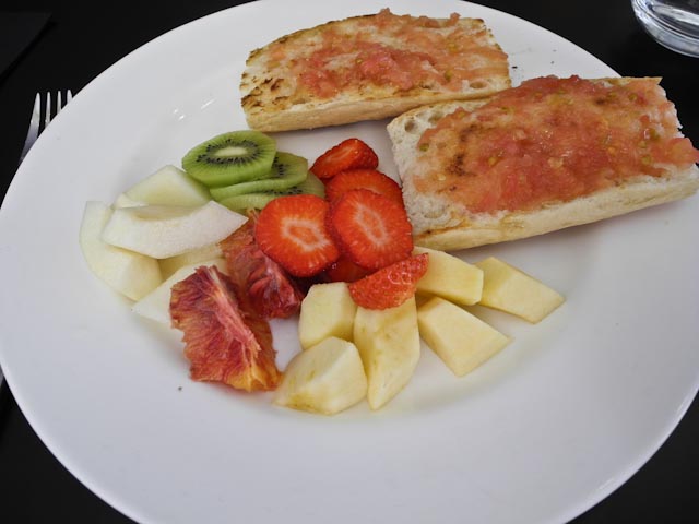 Yesterday was Mothers Day in Spain and to celebrate we slept in. Instead of doing breakfast at home we decided to slip over to Salatën and let them make our breakfast for us. I had a plate of scrambled eggs with some slices of ham and cheese on the side, pan con tomate, a cup of coffee and a glass of orange juice. Susan opted for the fruit plate with yoghurt and because they were out of croissants she had pan con tomate, also. We were the only ones in the restaurant, but given the number of tables that were being readied for lunchtime, the restaurant would be full.