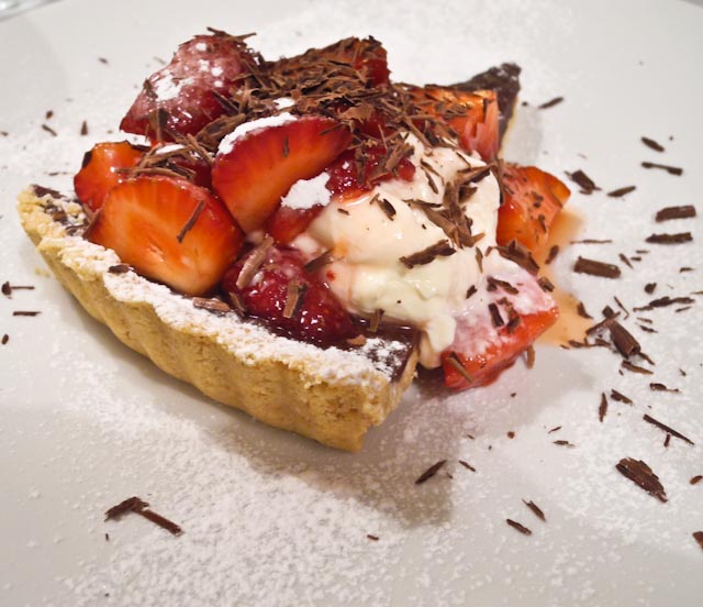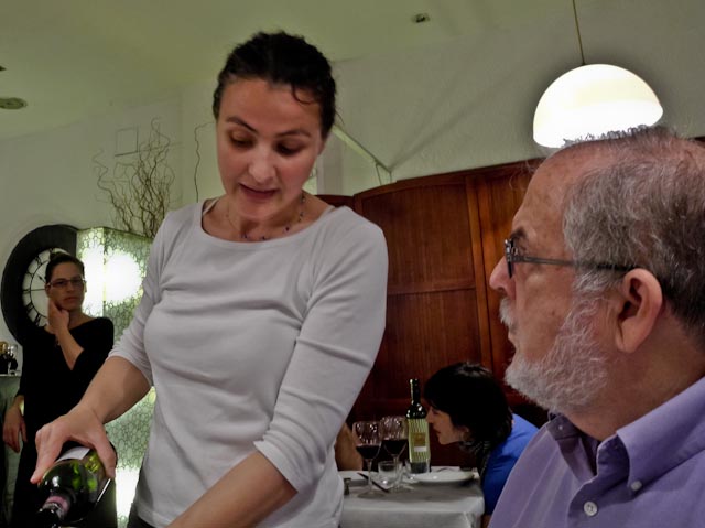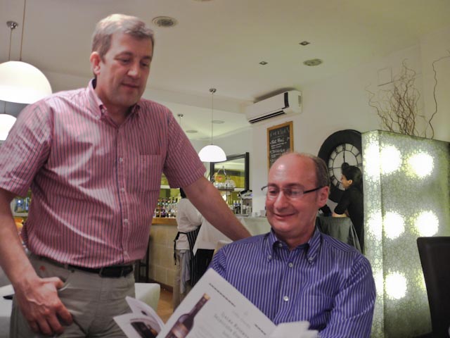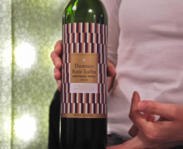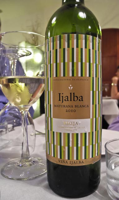 Last night’s wines came from Viña Ijalba a very small winery located in Logroño, which is the capital of La Rioja. We were to taste four wines – one white and three reds – and they were paired with an Indian Pori with a yoghurt dip, a warm goat cheese salad with dried cherries and walnuts, spaghetti and meatballs, roast duck with a potato dumpling and a chocolate pie with strawberries and whipped cream. The spaghetti course struck an odd note especially since the restaurant features Asian cuisine. Having said that the dish was perfectly prepared with the pasta al dente and the small meatballs dense and tasty.