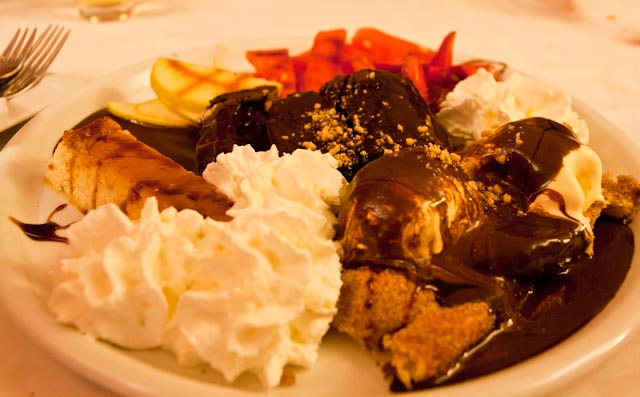 Canela has two special menus each of which offers three appetizers, a main dish and dessert. We ordered two of each menu for the four of us and that meant that we got to enjoy six different appetizers, a steak, a supreme of bacalao and a plate filled with a variety of desserts. The appetizers were, in no particular order: jamón serrano, pimientos de piquillo stuffed with seafood, a salad that featured smoked salmon and mango, a timbale of smoked fish, a crepe filled with vegetables and goat cheese that had been breaded and warmed in the oven and served with a raspberry sauce. We enjoyed all six, and we also enjoyed the steak and the cod. In spite of being filled to the brim, we managed to polish off the dessert plate that featured watermelon, strawberries, a profiterole, a brownie covered with warm chocolate sauce and a slice of cheesecake. We finished our meal with coffee and a complimentary mistela. We did enjoy a bottle of wine and our bill for the eating extravaganza was 106 Euros.