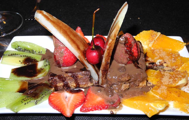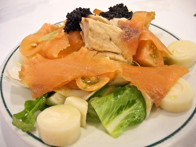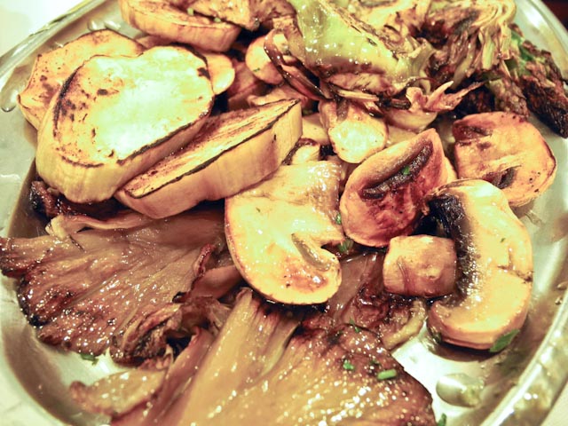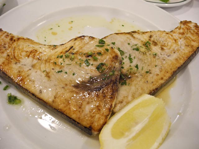 We ended up ordering the ensalada Joma that included lettuce, tomatoes, hearts of palm, tuna, smoked salmon, and fish roe. Thankfully we only ordered a half portion. We also ordered a half portion of grilled vegetables that included artichokes, two kinds of mushrooms, asparagus and potatoes. To accompany all of the foregoing we ordered some swordfish and were served two rather health swordfish steaks. Our dessert was a plate of sliced fruit that was as delicious as it was varied. We finished the meal with coffee. The bill for our meal, which also included bread and two glasses of wine, was 39 Euros. The service was attentive and the quality of the food was outstanding.