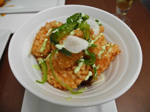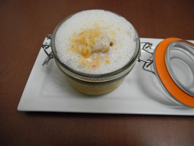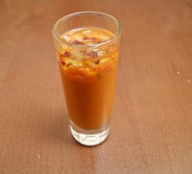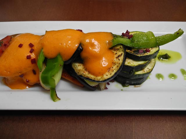 Ana waited on us and that meant that we would have both excellent food and excellent service. We started off with a plate of grilled vegetables that included tomatoes, onions, green peppers, sweet potato and zucchini. They were topped with a tomato foam and they were warm and crunchy and not at all rubbery as this dish sometimes can be when the vegetables are overcooked. Next came our langoustines that are first rolled in rice crackers and then cooked to give them an extra textural dimension. They were served with a plum sauce. Lastly we enjoyed a plate of sashimi that was served with sliced bamboo, Chinese sausage and a dab of wasabi. Heavenly is probably the best descriptive adjective to use. While we were finishing up the sashimi Ana delivered a gazpacho shooter and it was truly amazing helped by the fact that it was made with organic tomatoes. Dessert was a pudding made with mango and passion fruit. We split that because we were rather full. After our coffee and a chupito we made our way back home where Susan uploaded her profile on Eddie to her blog http://www.vistasdevida.com/ Be sure to check it out.