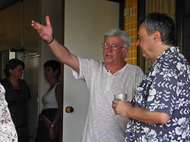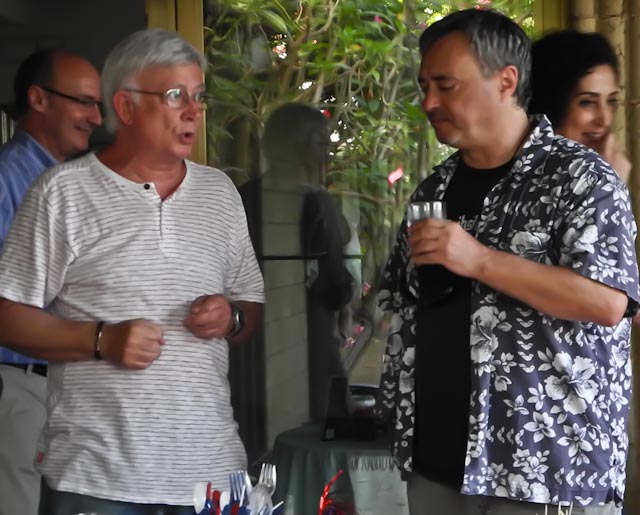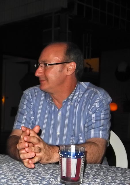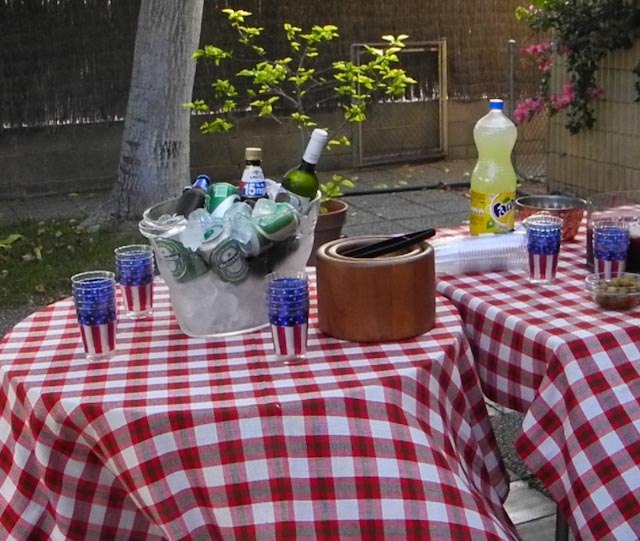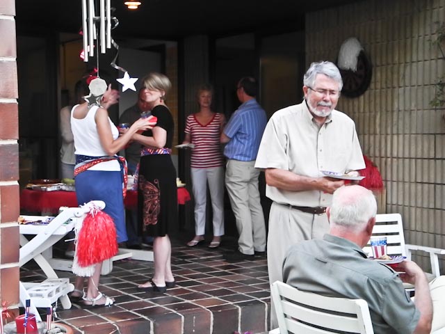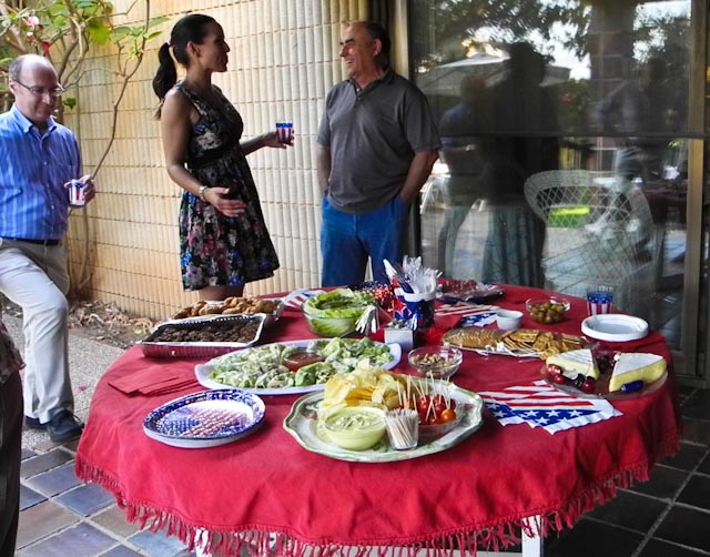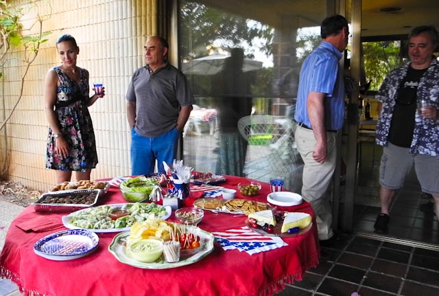 Brian came by at 7:30 and the five of us – Ofelia, Olivia, Brian, Susan and I – headed out to Rocafort for a 4th of July party at the home of Linda Casanova and her husband Vicente. Rocafort is a bedroom community of Valencia and it is some twenty minutes away from the city center by car. Their house was designed by Vicente and it is bright and airy with high ceilings. It has a goodly amount of green space and an ample patio. The party was a potluck and everyone was asked to bring their favorite beverage and a dish to share with all the guests.