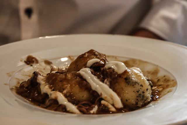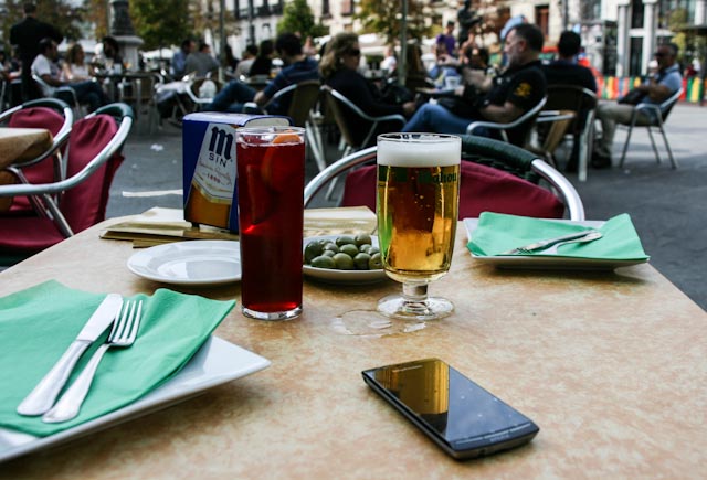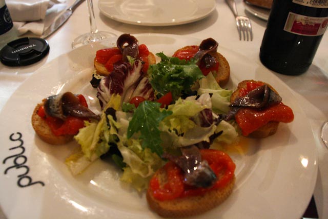 When we woke up on Sunday, it was close to 11:00 o’clock. We showered and dressed and went to a nearby café to get a cup of coffee and a small bite, small because Ramón and Juan Diego were coming by the hotel to take us out to lunch at 1:30. Because of the traffic they arrived a bit late and after they parked the car we decided to walk to a restaurant called Public, which is just off the Gran Vía. Here is a link to their website http://www.restaurantpublic.com/ .