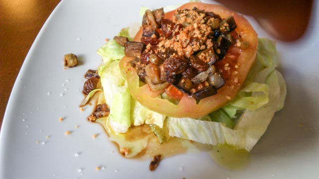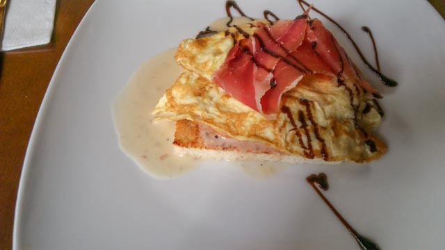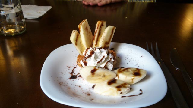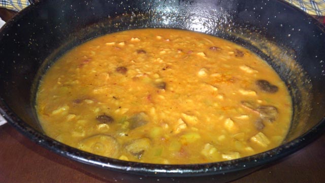 El Cuento is always a reliable choice. It is a no frills restaurant where the quality is always good and the food is always tasty. Susan started off with a salad that was topped with caramelized eggplant while I chose a tosta that was topped with a portion of a four-cheese omelet and crowned with a slice of jamón serrano. Our main dish was an arroz meloso with lomo, ham and mushrooms. It was the perfect dish for a rather brisk day. Susan had fruit for dessert and I had a café cortado.
