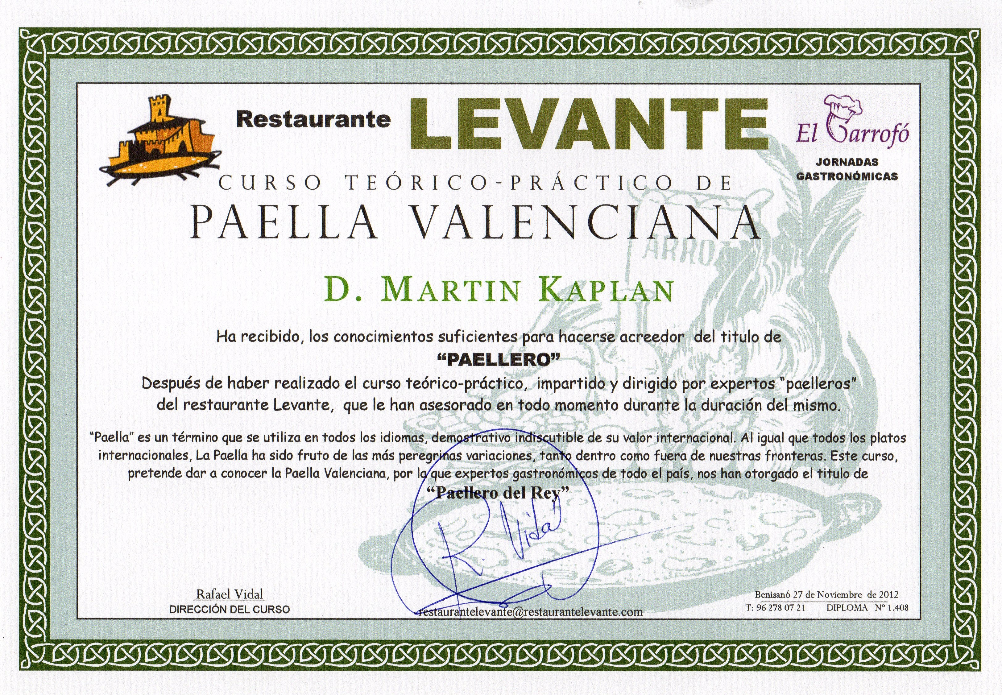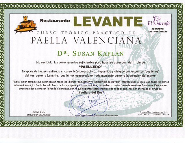 Graduation followed our meal. We were each presented with a diploma and a wallet-sizes ID that attested to the fact that we were graduates of the course. In addition to the toque and the apron we also received a bottle of wine, a sizeable quantity of the rice they use in their paellas and some dried beans they grow on their property. We also got a copy of the recipe. We left the restaurant with both our belly full and our arms filled. What a great experience.