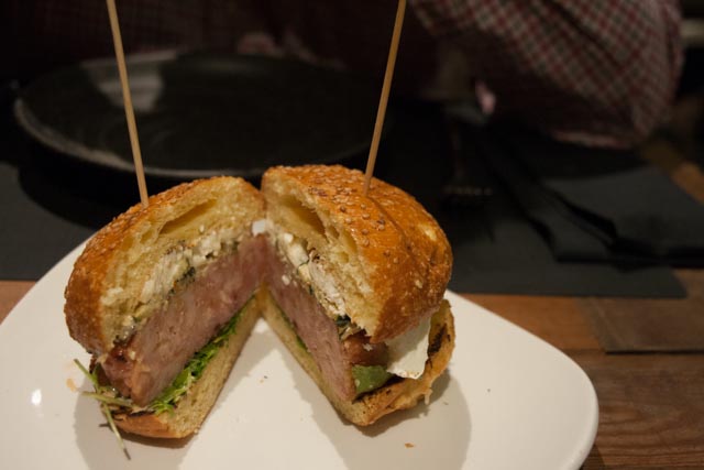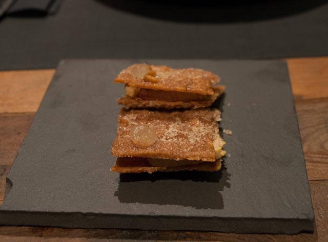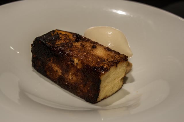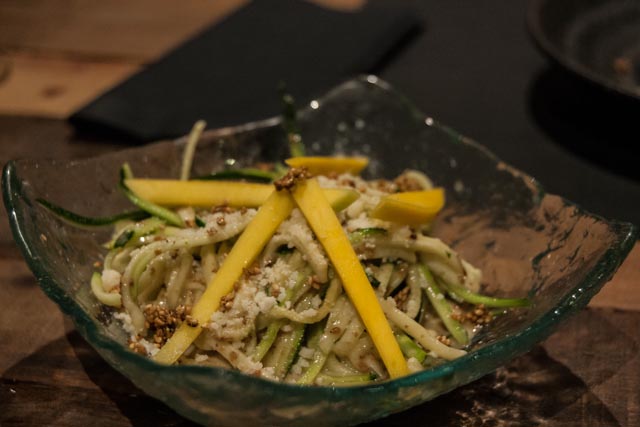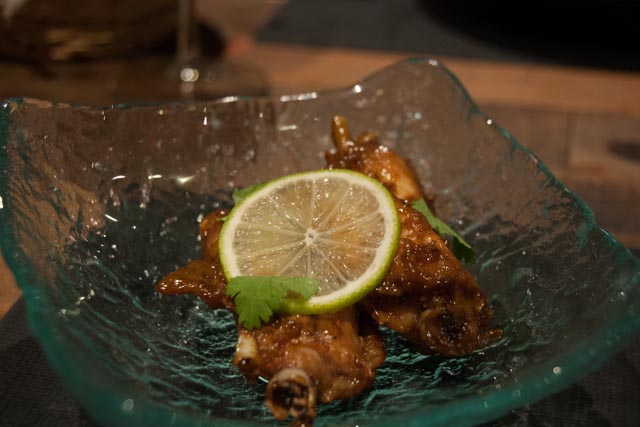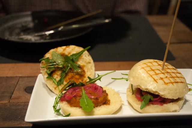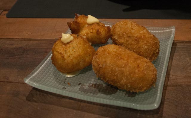 The sharing menu consists of ten dishes and is, in essence, a tasting menu. The portions are small, but we can attest to the fact that one is hard pressed to finish every dish without achieving that too full feeling. In no particular order we sampled the following: pastisset de aguardiente con boniato y foie – a creamed mixture of foie and sweet potato sandwiched between two layers of a cookie-like pastry -, croquetas de pollo, buñuelos de bacalao, ensalada de cintas de calabacín, fideos de arroz, parmesano y sesame – a salad with rice noodles, strips of zucchini, topped with parmesan and sesame seeds -, vitello tomato, bocatas de langostino, alitas de pollo, mozzarella de bufala con berenjena asada y granada, hamburguesa de pollo and torrija caramelizada con helado de mantecao.