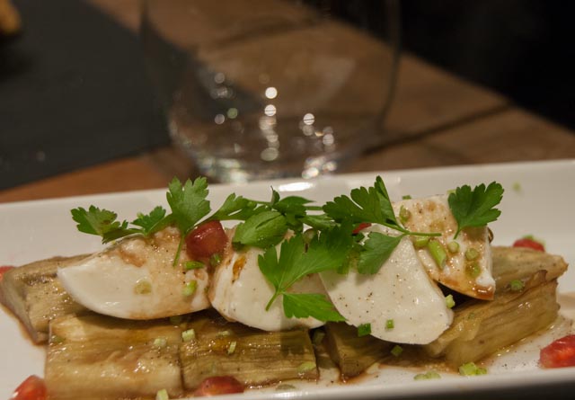 It is located close by the Russafá Market in the neighborhood that has become the spot for innovative cuisine. It took us about twenty minutes to walk there and only a few tables were occupied, but soon after we were seated every table was occupied. The space is long and narrow. There are tables on each side of a rather narrow aisle with enough space for the wait staff to easily serve at every table. Even though it was Saturday there was a menu of the day, as well as a sharing menu. After studying both options, we opted for the sharing menu.