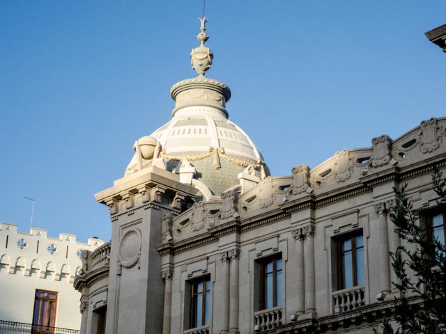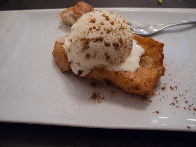 Susan began her meal with a crema de verduras served with a bit of chopped ham. I began with the ensalada templada – a combination of lettuces served with warm mushrooms and chicken. Our main dish was an arroz meloso con sepia y cangrejo (crab). The dish was outstanding because the seafood broth in which it was cooked was outstanding. Susan had baked pumpkin for dessert and I opted for the torrija topped with a small scoop of ice cream. We ended our meal with coffee and a chupito.