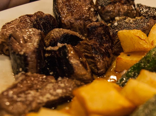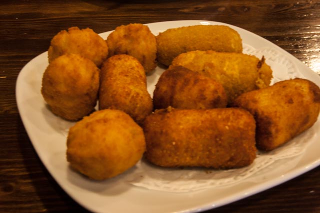 After eating at home for the past few days we decided to have lunch at Carosel. The tabla de entrantes yesterday featured a ham-based broth, a coca de escalibada, pescadito adobado and a fried dumpling filled with spinach and morcilla. Our entrée was paella con pollo, alcachofas y costillas. One of the other possible entrees was a stew of fabes y langostinos. I asked if I could have a taste and somehow a taste ended up being translated as a small casserole dish. It was the perfect dish for a cold day. Dessert was a chocolate extravaganza with a variety of tastes and textures.