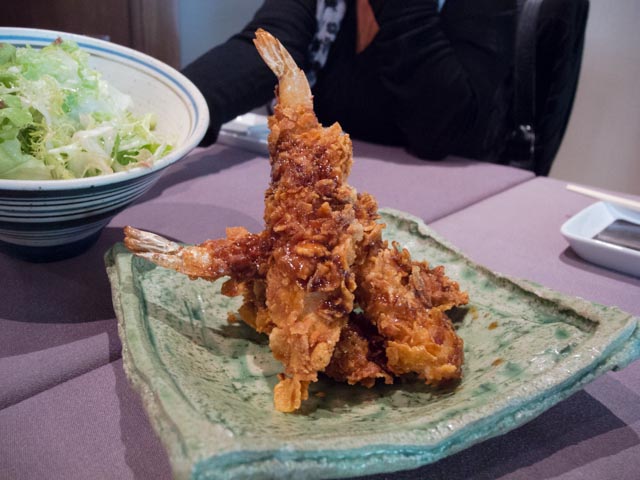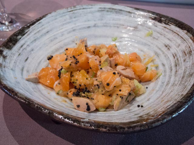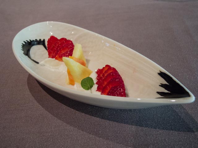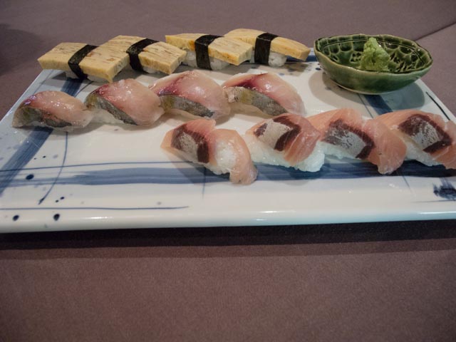 The menu consisted of: fried prawns with a corn flakes coating, finely cut white fish in a ponzu sauce, salmon tartar, nigiri selection of the day, California roll with shrimp, Iberian pork dumpling with ramen soup and fruit sashimi. The cost of the menu was 33 Euros per couple with wine, beer and coffee being extras. All dishes were fresh and tasty and it will be worthwhile to return and explore the regular menu to see if there are more complex tastes present in other dishes.