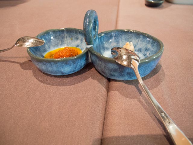 We were told that the everyone at the table had to order the same set menu with the alternative being to order a la carte of the menu. This made no sense to me and so I said to her, “What you’re saying is if we sit a two separate tables we could order two different menus of the day, but because we are sitting at the same table we cannot do that?” Finally things got straightened out and we all had the same basic menu with Klaus and Zahava getting two vegetarian substitutions.