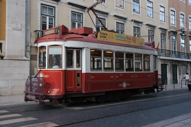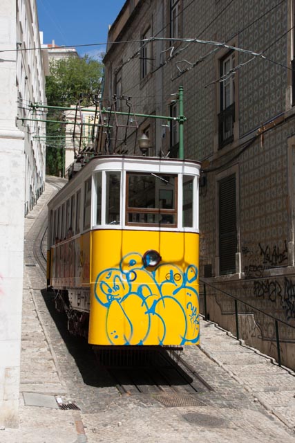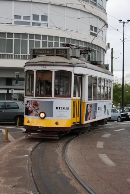 After a rather delightful breakfast we followed the direction we were given that would take us to the stop for Tram 28. Tram 28 is a star attraction for tourists since it winds its way through narrow and steep hills and gives you sort of an overview of a number of Lisbon’s neighborhoods. The trams look exactly like the streetcars that were part of my growing year in Dorchester, Massachusetts. My mind easily morphed into the ride along Blue Hill Avenue when I was five or six years old. We caught the tram close to the riverfront and took it to its terminal at a rather large cemetery. The seats on the tram were quickly filled and as we made our way up the hills the car became more and more crowded with passengers pressed tightly together. There are signs all over the walls of the tram alerting one to be aware of pickpockets because as you stand holding on for dear life to the leather straps above, you are a prime target for having your wallet lifted.