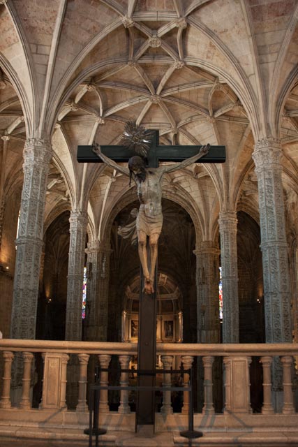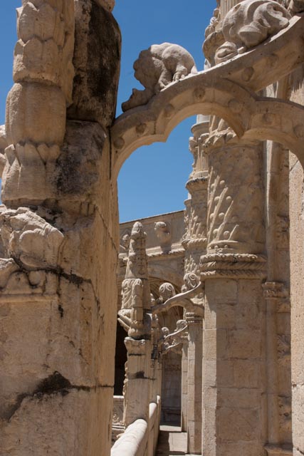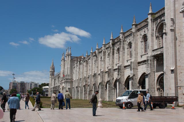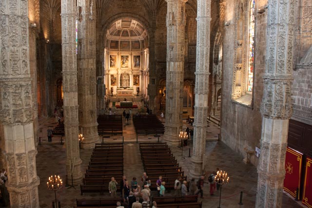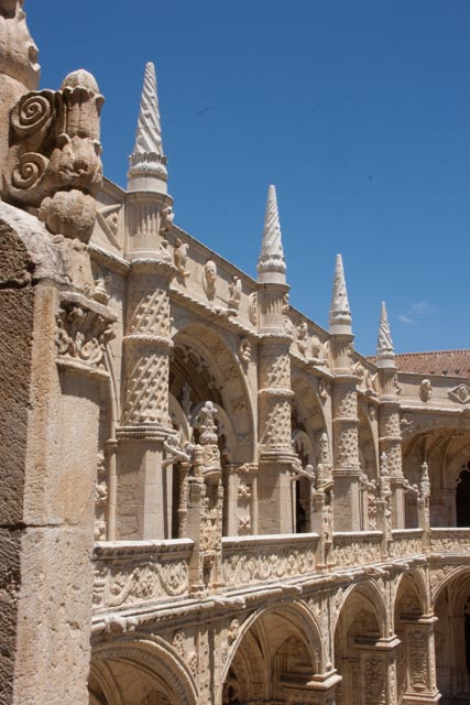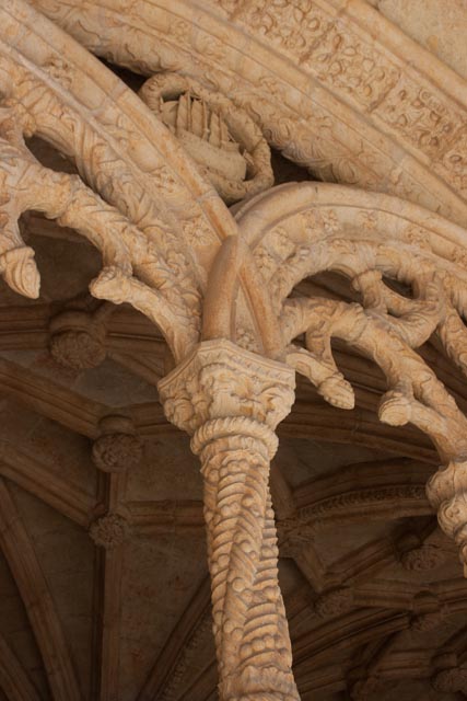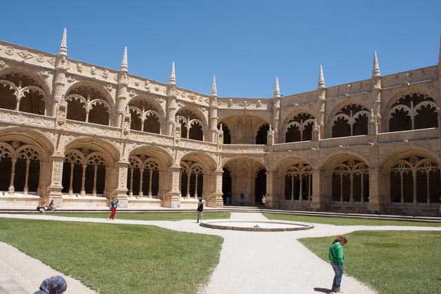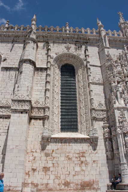 The sun is out in full force for the first time during our visit. After breakfast we hailed a cab and had him take us to the Mostero Dos Jeronimos (Monasterio de los Jerónimos) in the Belém neighborhood of Lisbon. Located near to the Tagus River it dates from 1502 to commemorate the voyage of Vasco da Gama thanks to the intervention of the Virgin Mary that insured the success of that most difficult voyage. The monastery was built so that the monks could pray for the well being of the king and the safety of all sailors. It is built in a style that is called Manueline that features a wide variety of columns, each of which appears to have a different motif. There are a number of marine elements present in the columns most notably shells and rope similar to that used on ships. It does have many Gothic elements and it occupies an amazing amount of acreage. I think the most impressive part of the visit was the church, which although simply decorated conveyed a sense of peace and tranquility that one might hope to find in God’s house. There is an amazing view of the church from the choir that sits above it. Our visit ended a little after 2:30 and since we had more ground to cover in the Belém area, we searched for a restaurant.