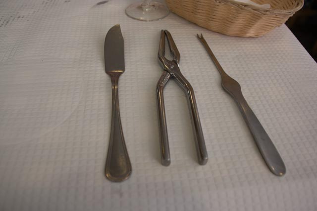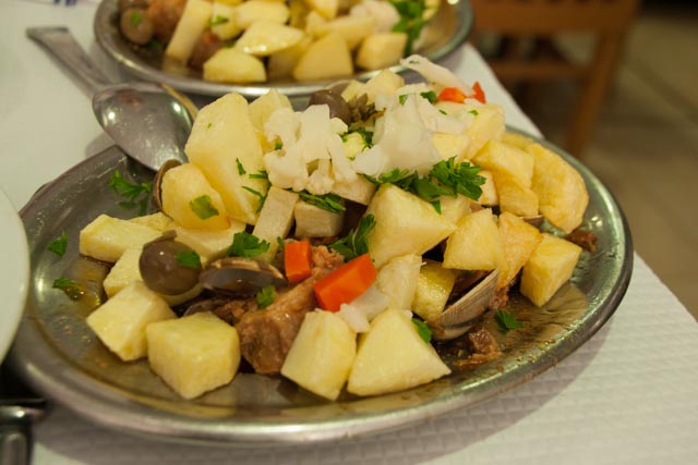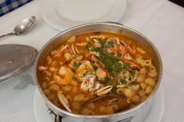 When it came time to look for a restaurant, I asked a local for a suggestion. We followed his instructions and found ourselves in front of a restaurant that was absolutely empty. Walking back down the hill and turning to the left, we spotted a nautically themed restaurant called Cervejaria Marisqueira Camoes. There was a large aquarium filled with crab and lobster, as well as a refrigerated display case of all their freshly caught fish. We went light on appetizers to leave room for what turned out to be an enormous stew of macaroni and all kinds of shellfish cooked in a savory tomato based broth. We extracted dozens of peeled shrimp, clams, mussels, lobster, pieces of crab and crawfish and when we had eaten all we could the stew pot was still one-third full.
