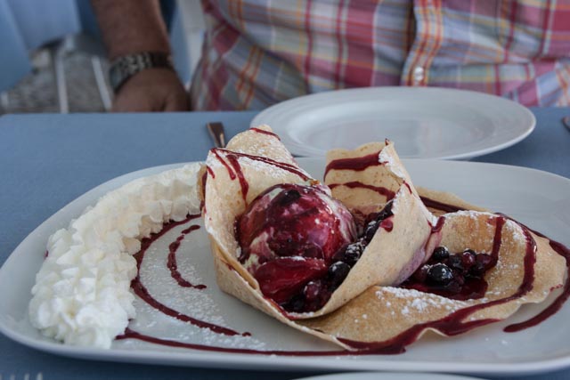 It was time for lunch and we spied a restaurant called Paris that in addition to its extensive interior had a number of tables on its terrace. We were shown to a table and proceeded to study the menu. We started our meal with a warm goat cheese salad that was topped with a variety of fresh berries. Susan had some baby goat for her main course and I opted for the pork and clams dish. Both entrees were extremely tasty. The good news is that we still had room for dessert so Susan and I shared a crepe that was topped with a raspberry coulis and a healthy scoop of pistachio ice cream. When we finished our coffee, it was a little after 5:00, so we gathered up our stuff and walked back to the train station.