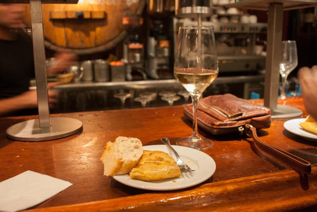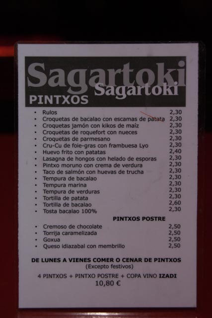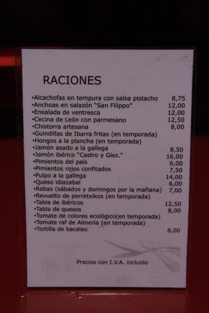 We caught up with Paquito and Gioco after the show and, as fate would have it, we ended up at Sargatoki once again. It was jammed and we were fortunate to find a table outdoors. We discovered that although most bar, restaurants and cafes in Vitoria have outdoor tables, there is no table service, per se. You go up to the bar and place your order and carry it out yourself. They will only deliver dishes that need to be cooked. We ordered a variety of things, as well as a beer or two. We paid the bill and then went off on our separate ways.