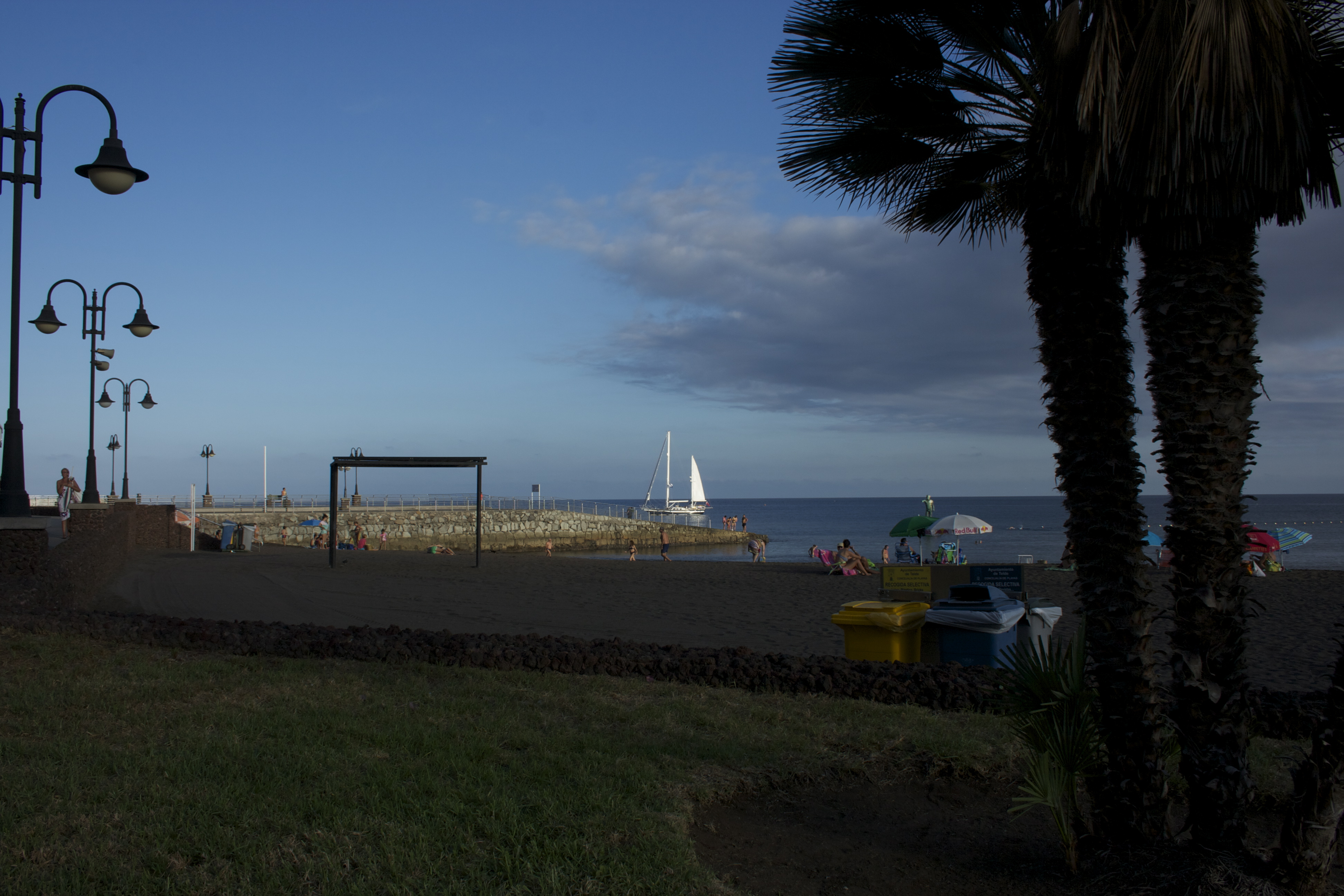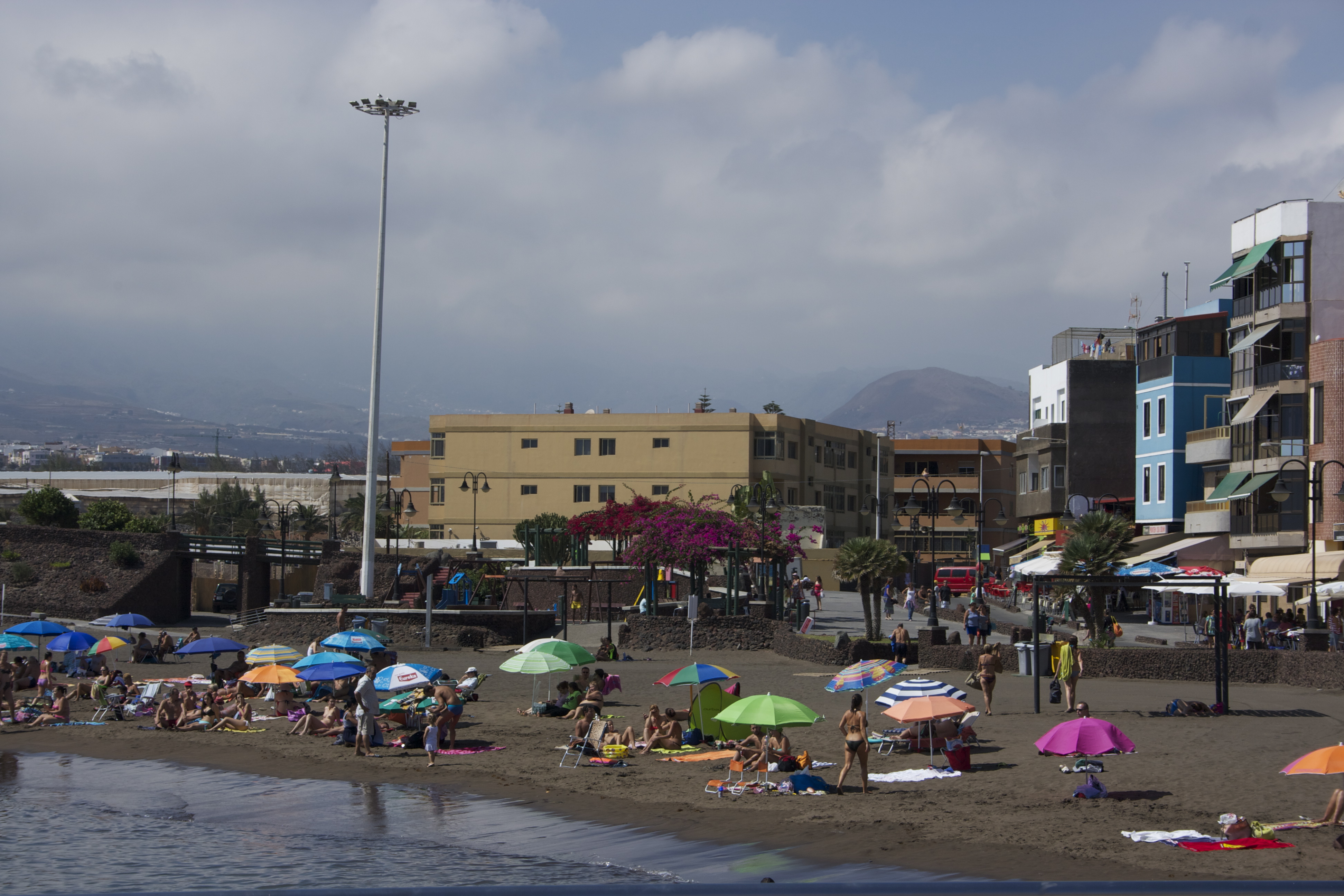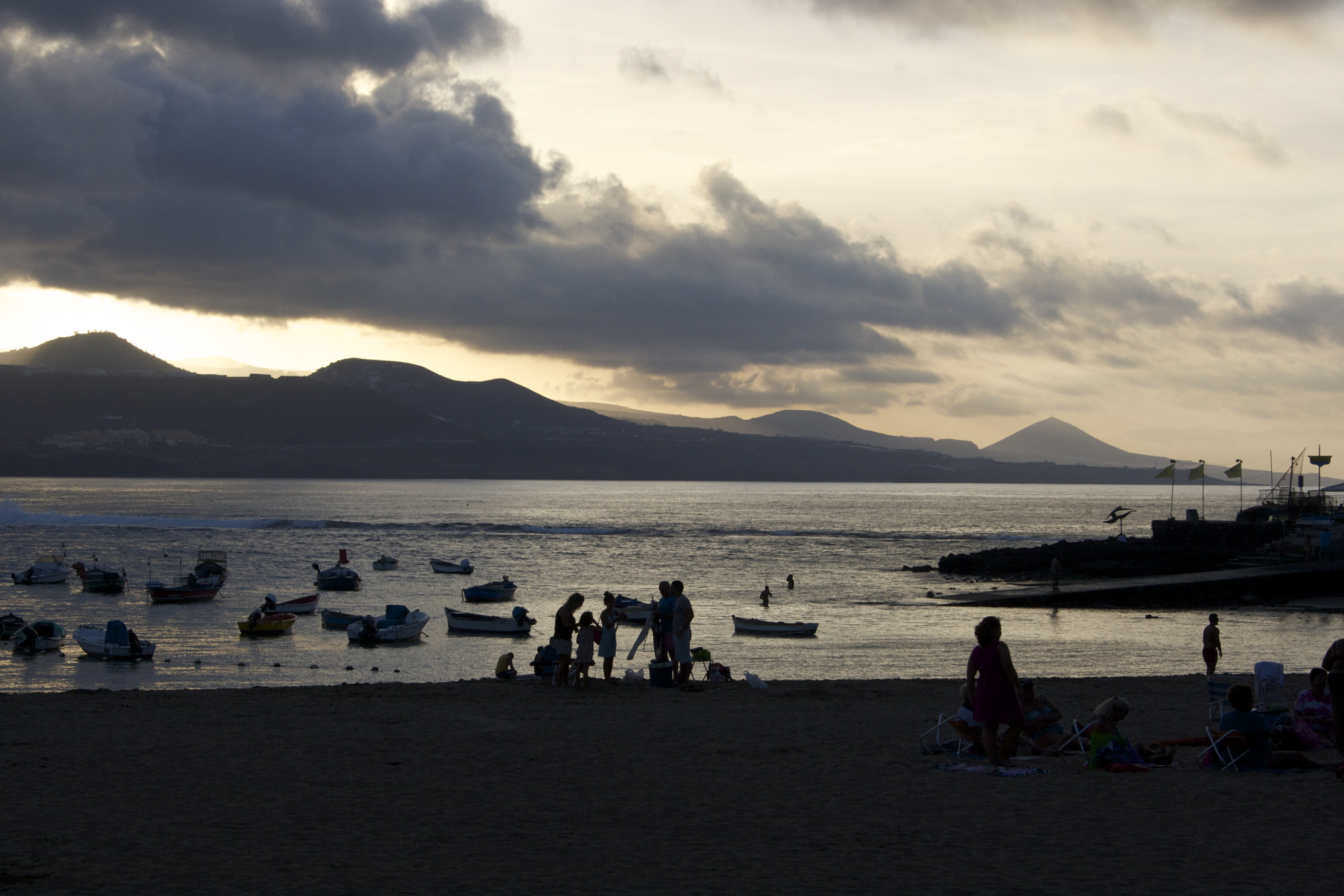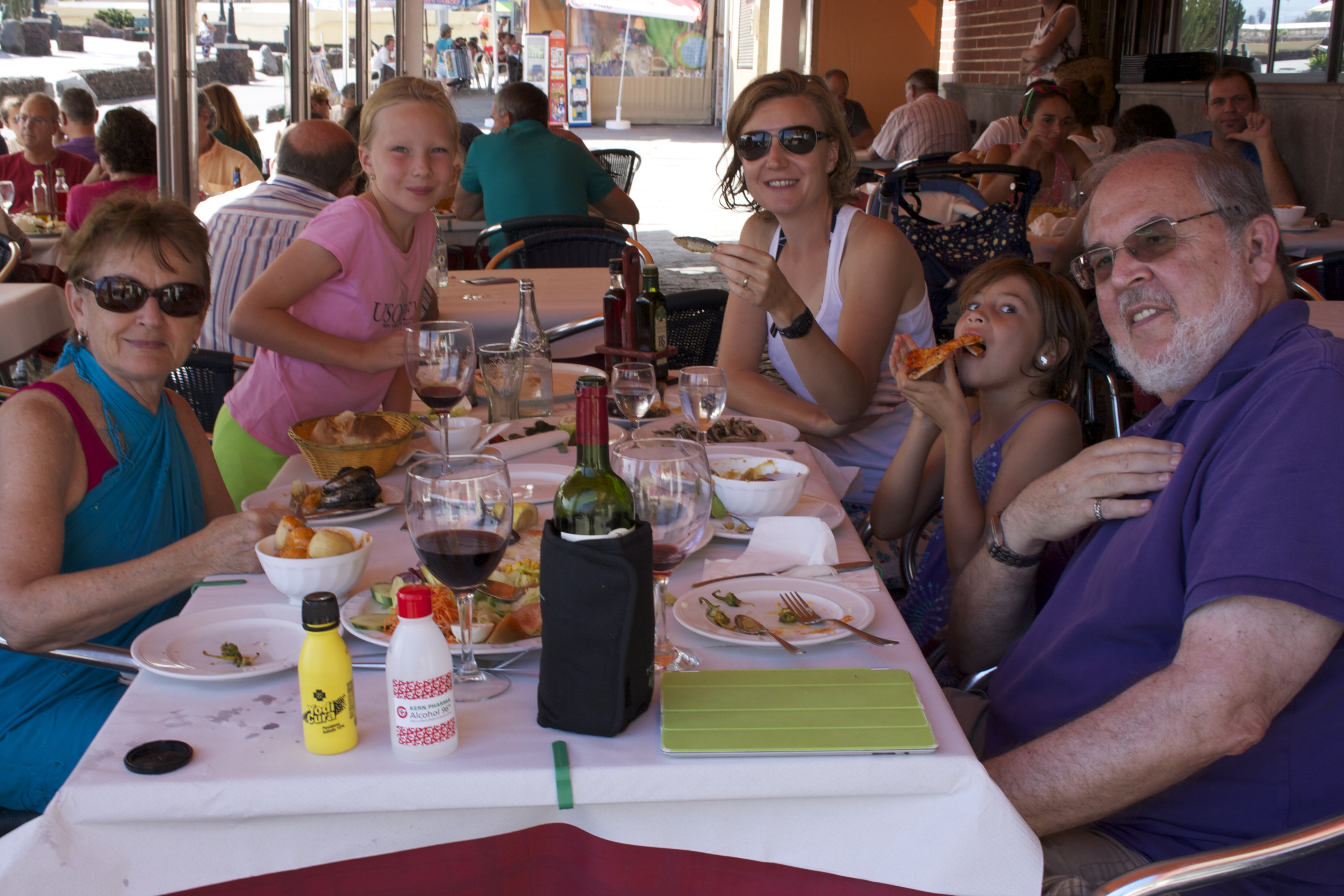 After studying the menu we decided to order a number of dishes for sharing. In no particular order we had a salad, pimientos de Padrón, papas arrugadas, gofio (a grain that is mixed into a paste and spread on onions, lettuce or bread), a pizza, brochetas de carne and a whole fish. We also managed to empty two bottle of Ramón Bilbao, a lovely crianza from La Rioja. The girls went to a nearby ice cream stand for their dessert. Lucy’s ice cream met an untimely death when it fell to the ground. I went back to the store with her and the young woman behind the counter replaced the fallen ice cream at no charge. Yet another reason to like Las Palmas. I lingered on at the café while the crew went back to the beach for more fun in the sun. Juliet then drove us back to the hotel and we stayed put for most of the evening except for a brief escape for ice cream.