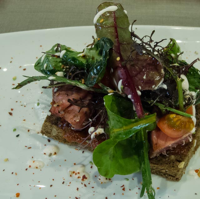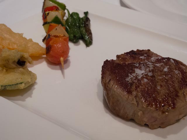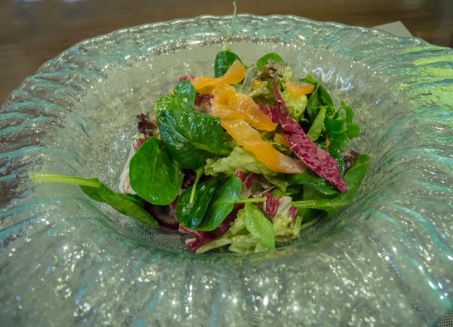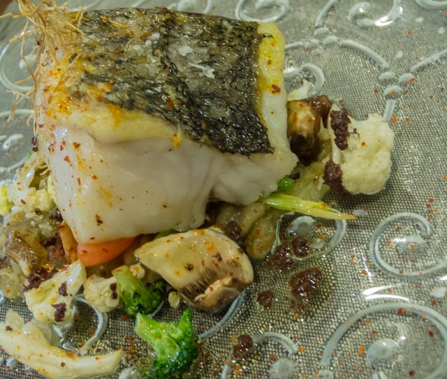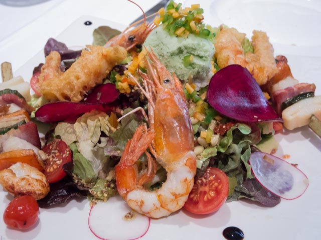 After studying the menu we decided to order the warm salad with a variety of seafood – octopus, shrimp and langoustines – and a steak that we wisely shared given how filling the salad was. We shared a scoop of vanilla ice cream with chocolate sauce for dessert. We finished the meal with coffee and a chupito. In the course of the meal we enjoyed three glasses of wine and a bottle of mineral water. Our lunch in this white tablecloth restaurant came to a total of 63 Euros.