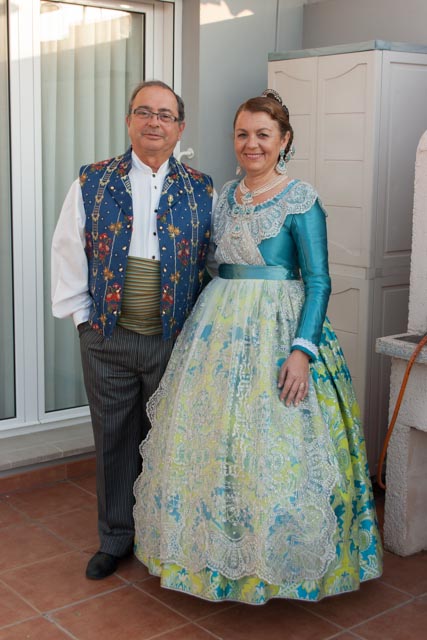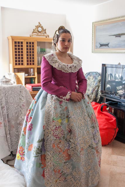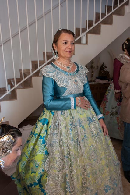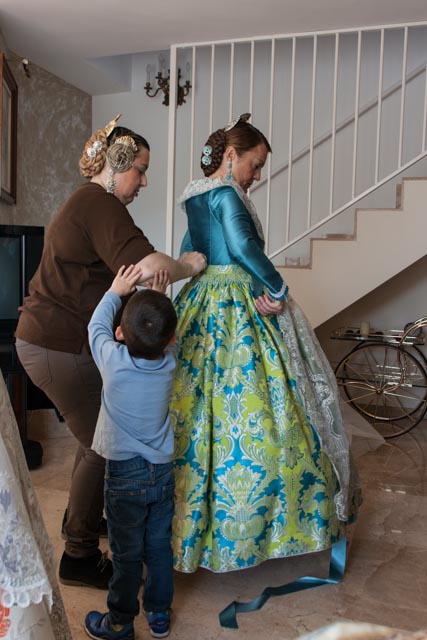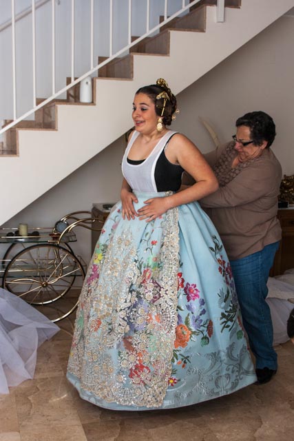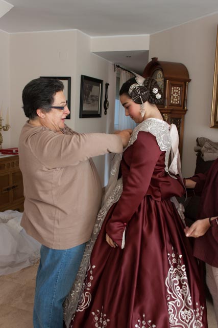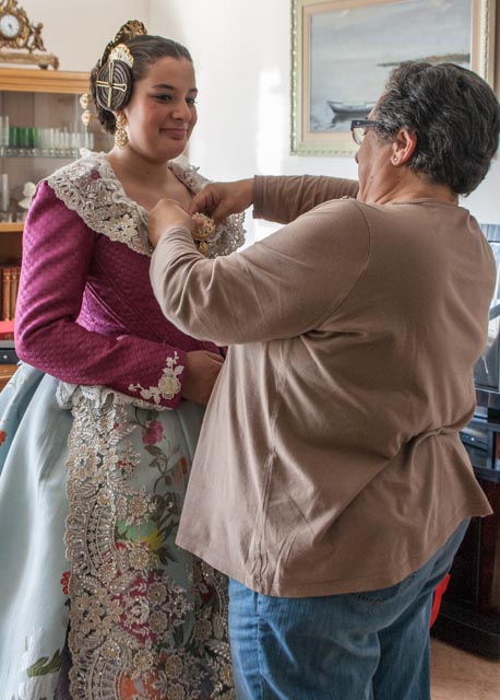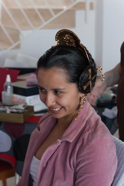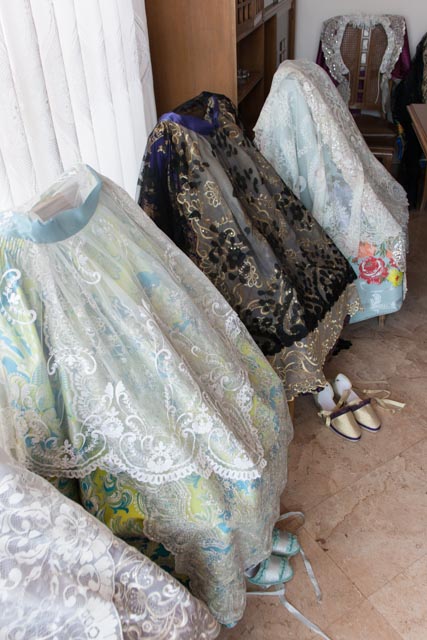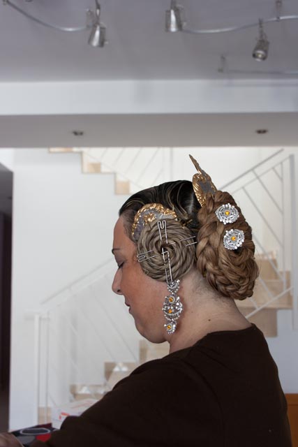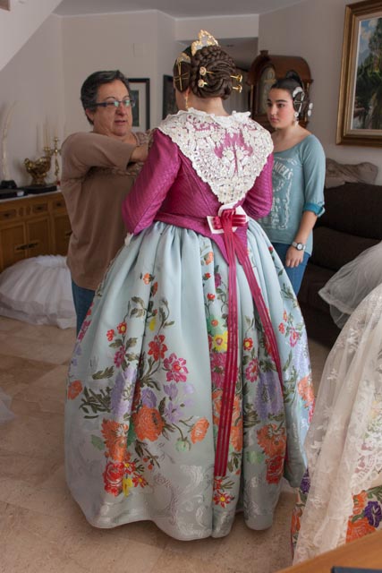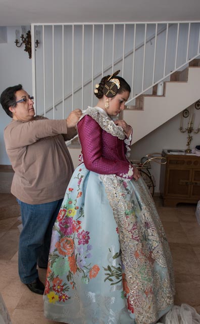 I stayed home yesterday to work on several projects that needed completion and Susan headed off to the casal around 2:00 for lunch followed by a rather intensive photo shoot of the preparation involved in getting the falleras mayors dressed and ready for their participation in the ofrenda. The photos that accompany this brief post will help you understand what is involved in the process.