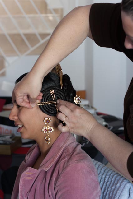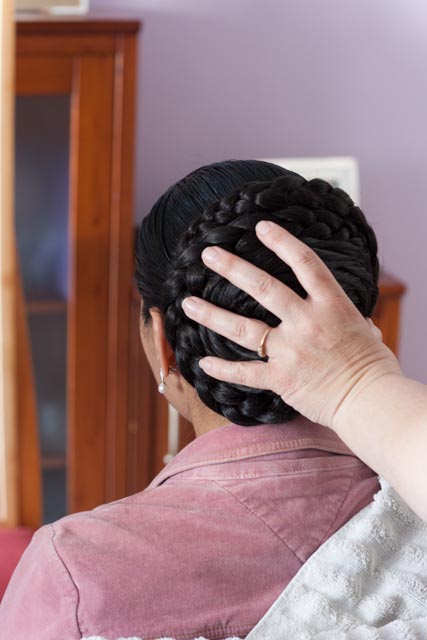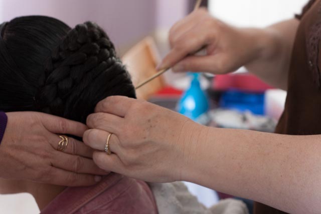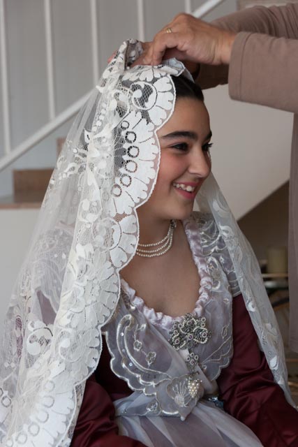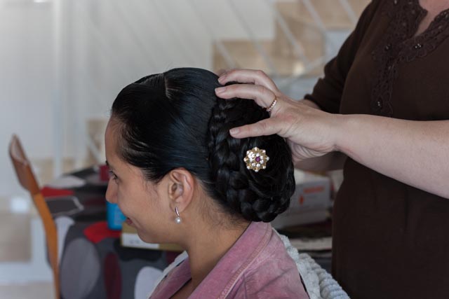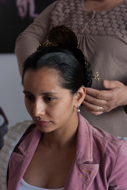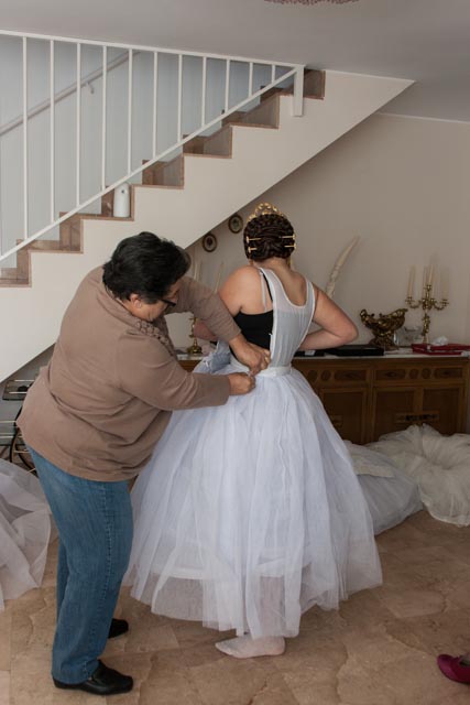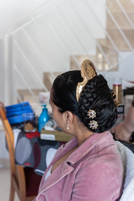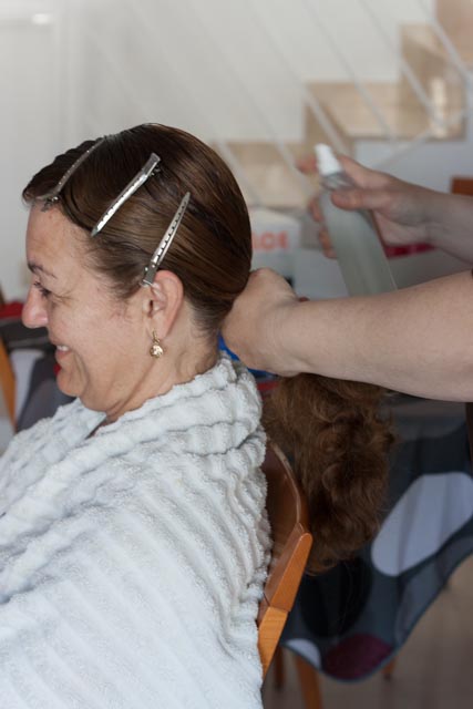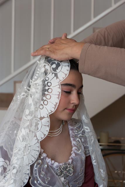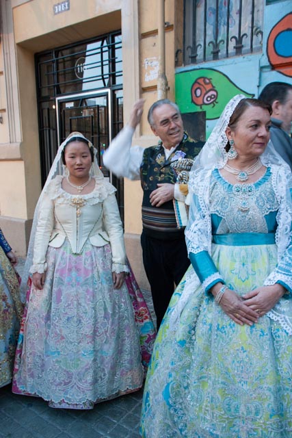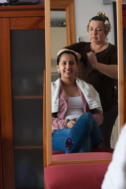 I stayed home yesterday to work on several projects that needed completion and Susan headed off to the casal around 2:00 for lunch followed by a rather intensive photo shoot of the preparation involved in getting the falleras mayors dressed and ready for their participation in the ofrenda. The photos that accompany this brief post will help you understand what is involved in the process.