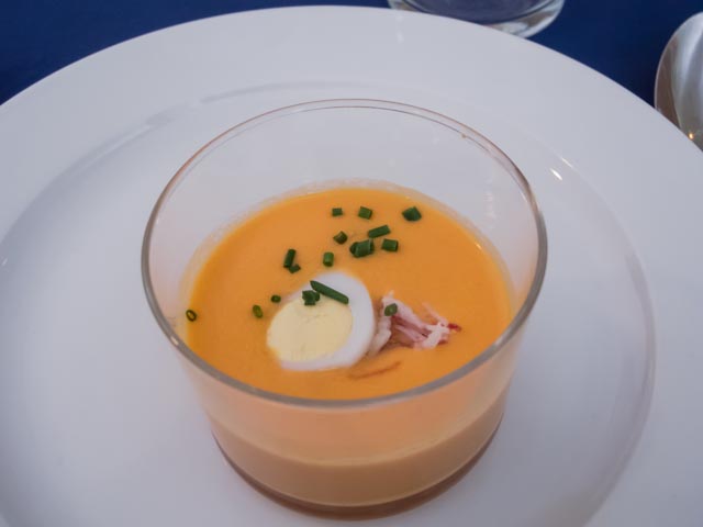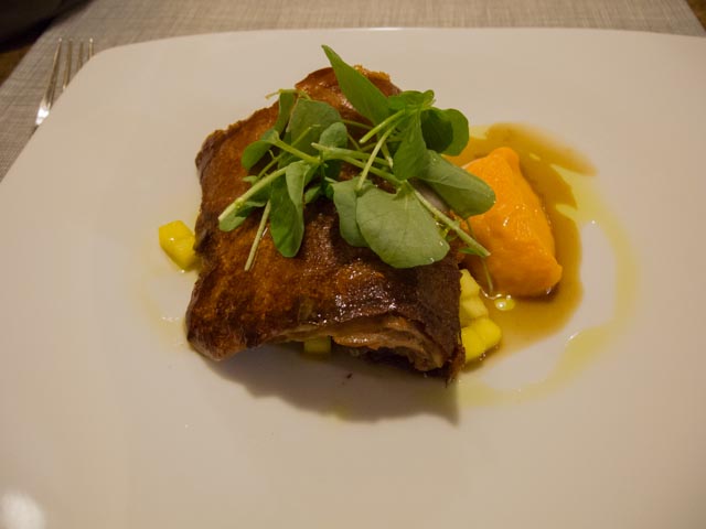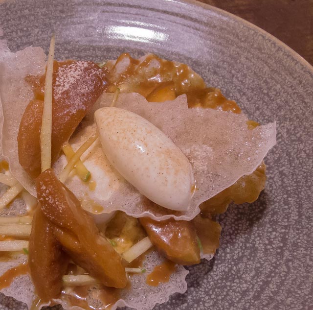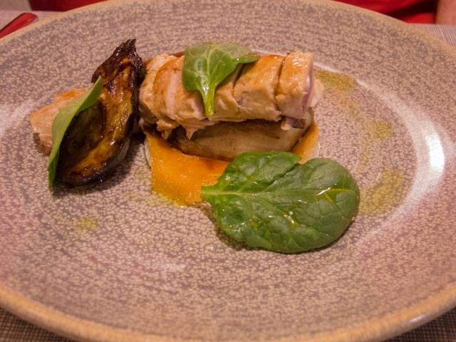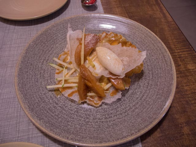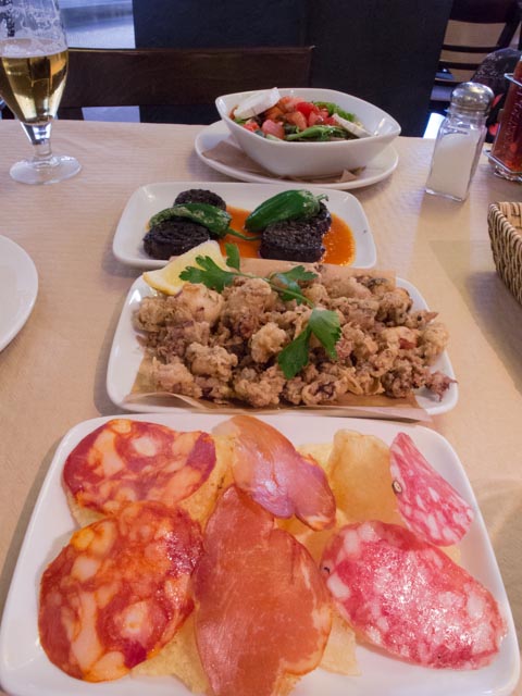 The restaurant is has both a very attractive exterior and interior. There were only a few diners when we arrived a little after 3:00 and we were shown to a side table for two. Over a beer for me and a glass of wine for Susan we studied the menu. We decided on a couple of Croquetas Crujientes de Arroz al Horno, Ensaladilla “Quintana” con sorpresa de Mar. For her entrée Susan chose the Cochinillo Crujiente con Tartar de Mango, berros y calabaza and I opted for the Solomillo de Bonito con queso de cabra y berenjena a la llama. Dessert was a deconstructed version of a tarte tartin. Every dish was attractively presented and absolutely delicious. Our bill was a bit more than we usually spend. In addition to the dishes we sampled we also consumed a beer, three glasses of wine, a bottle of water and two coffees. The final damage was 85 Euros, which we felt was well worth the experience. We shall return another day.
